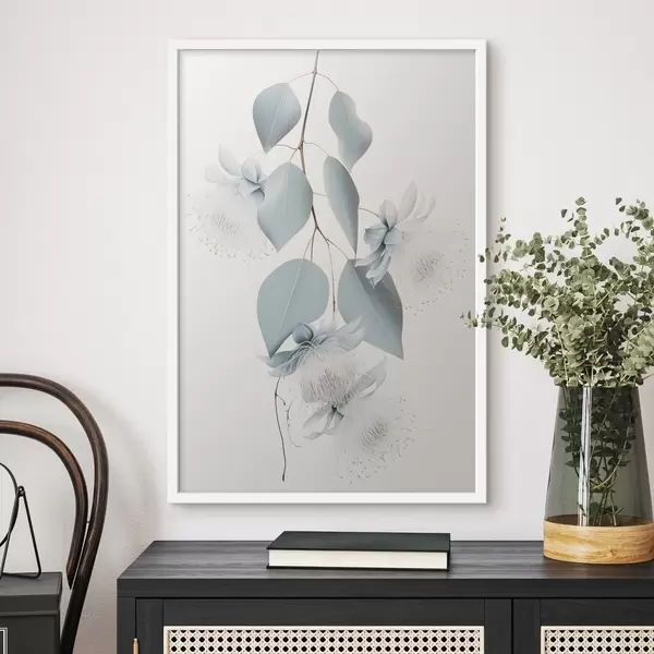 Poster Ramo di eucalipto con foglie blu e fiori bianchi, sfondo chiaro Nr f45947