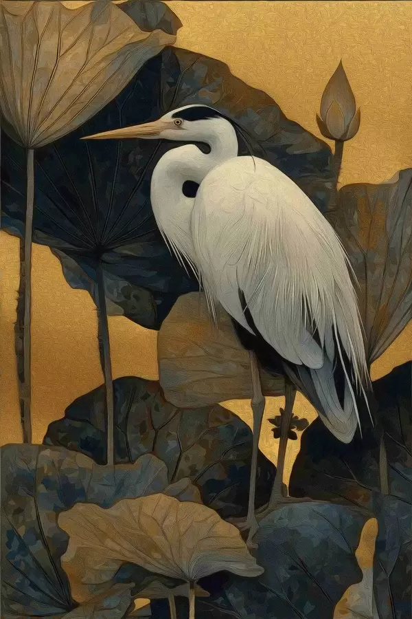 Poster Airone bianco tra grandi foglie su uno sfondo caldo Nr f46147