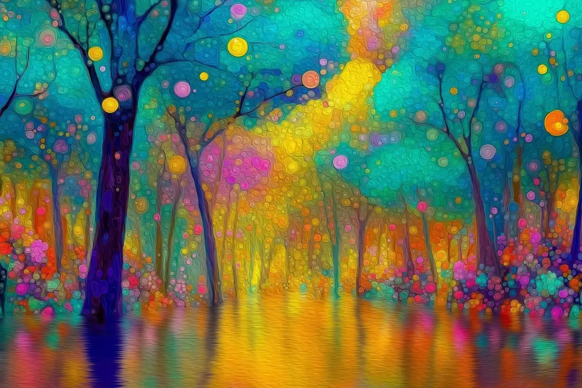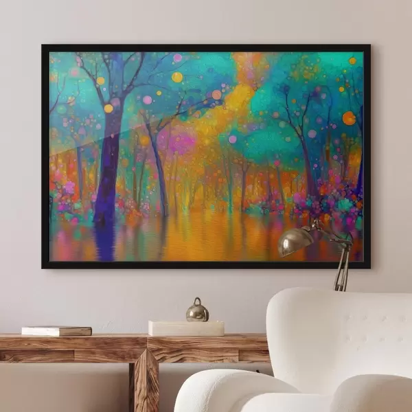 Poster Foresta fantastica dai colori vivaci con riflessi nell'acqua Nr f46171