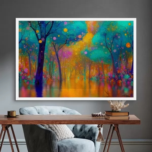 Poster Foresta fantastica dai colori vivaci con riflessi nell'acqua f46171