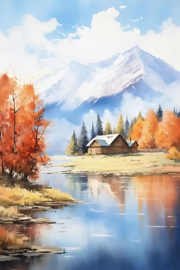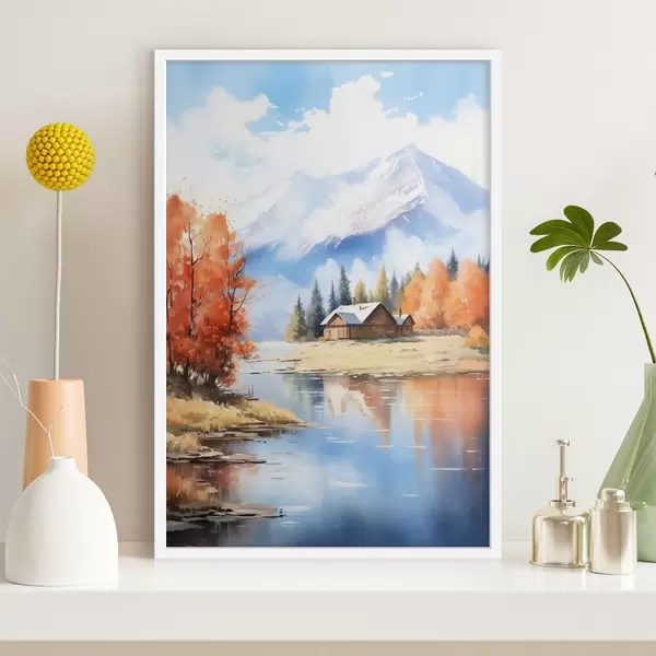 Poster Paesaggio autunnale in riva al lago con una casa e le montagne Nr f46184