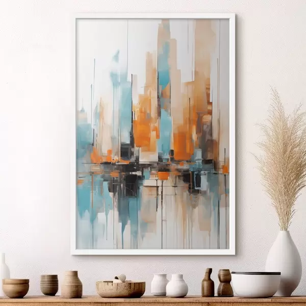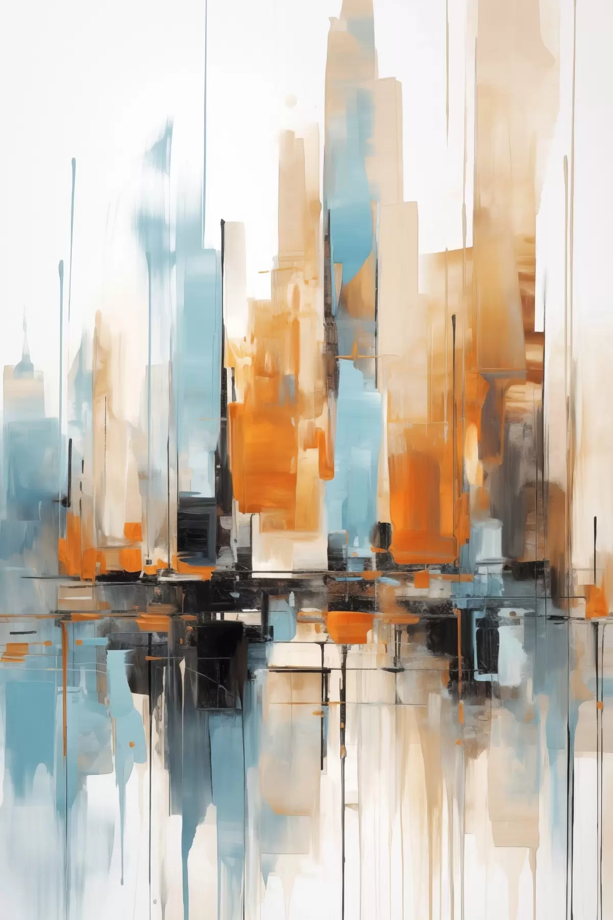 Poster Paesaggio urbano astratto con pennellate verticali nei toni dell'arancione, del blu e del bianco, stile pittorico Nr f46267