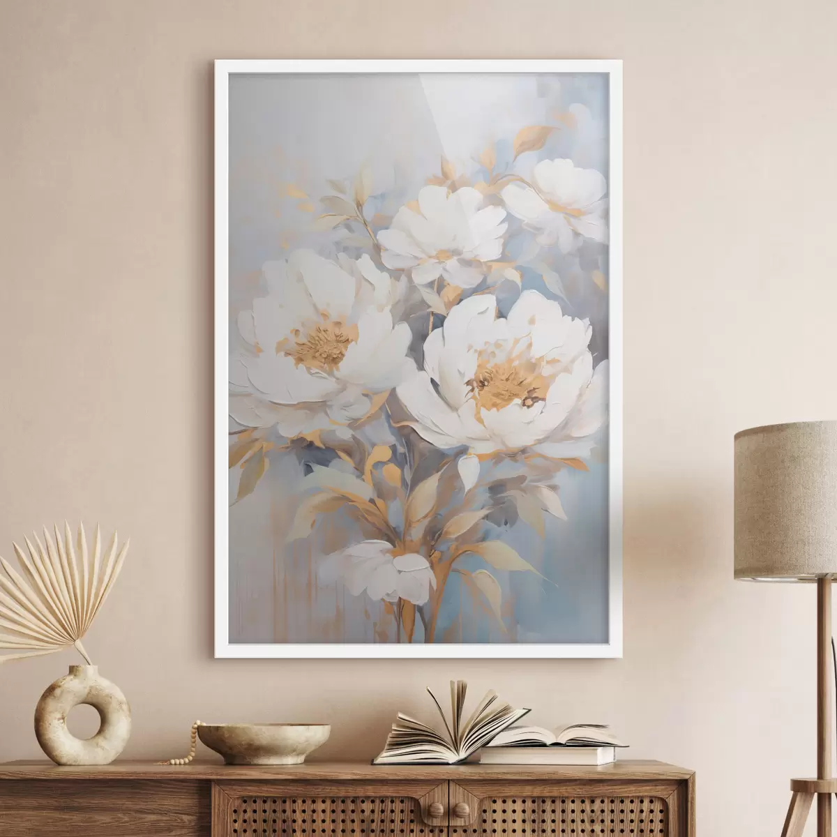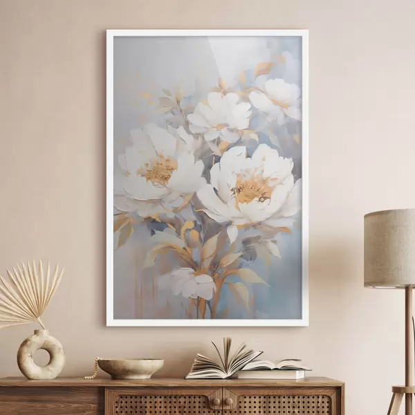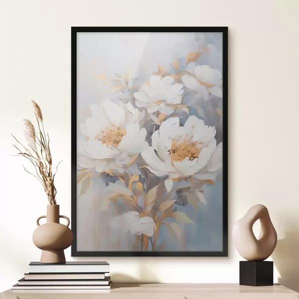 Poster Peonie bianche con centro e foglie blu, pennellate morbide, sfondo azzurro, composizione floreale Nr f46270
