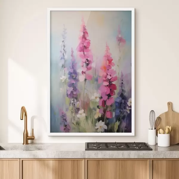 Poster Fiori rosa e viola con margherite bianche in un campo, pennellate morbide, colori pastello, stile impressionista Nr f46279