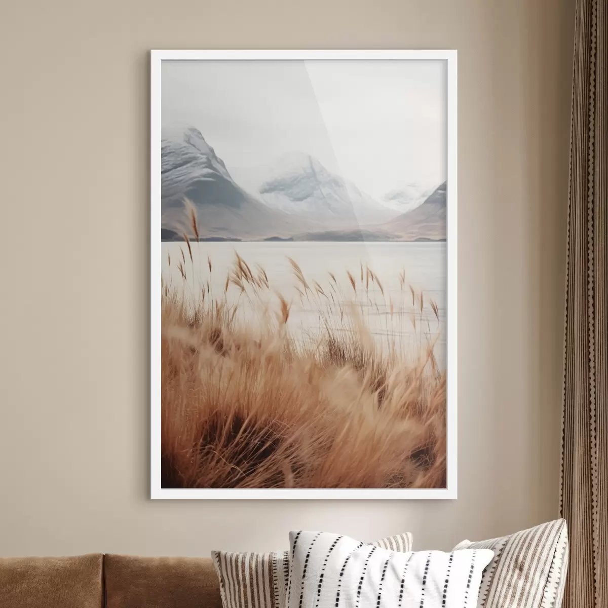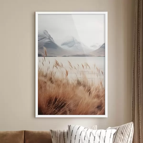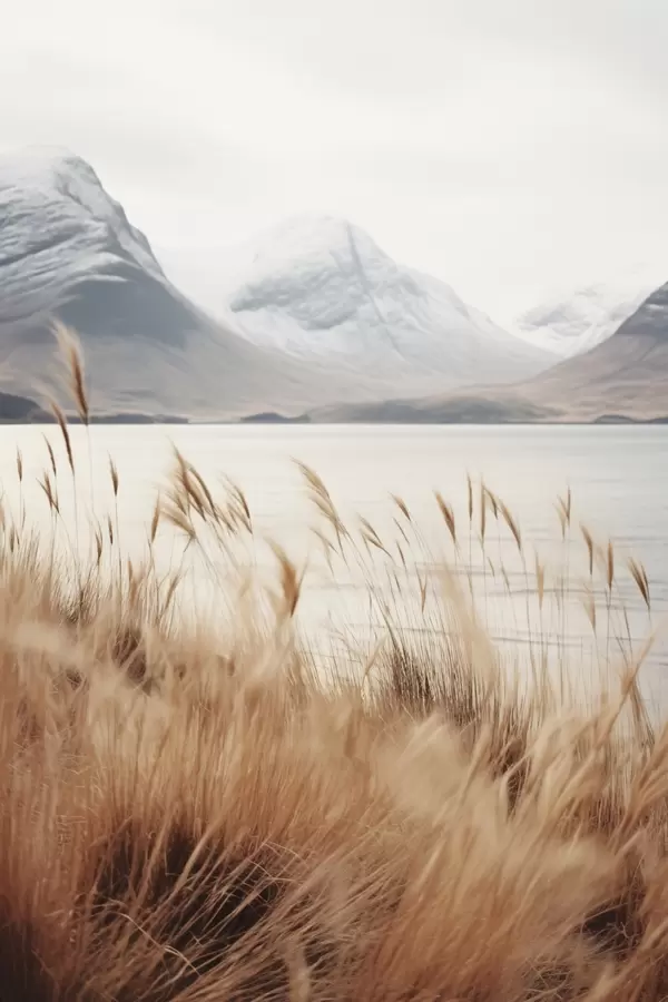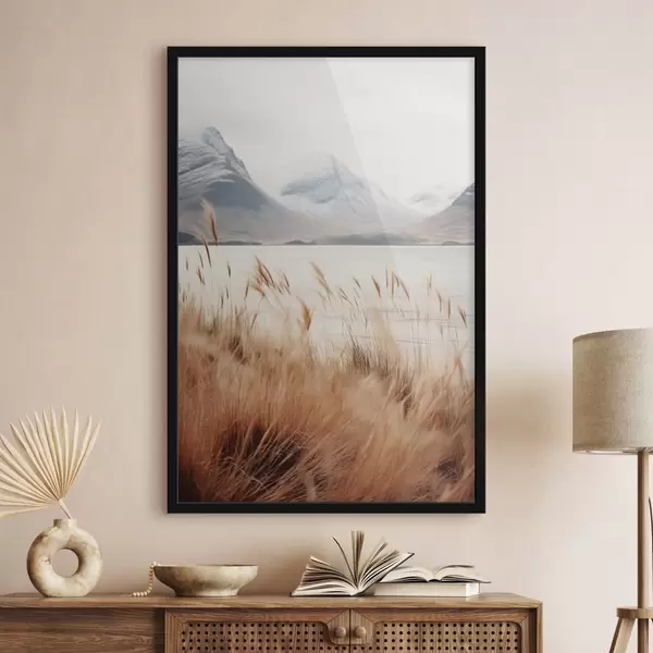 Poster Campo di erba della Pampa davanti a un paesaggio lacustre con montagne innevate sullo sfondo, luce soffusa Nr f46282