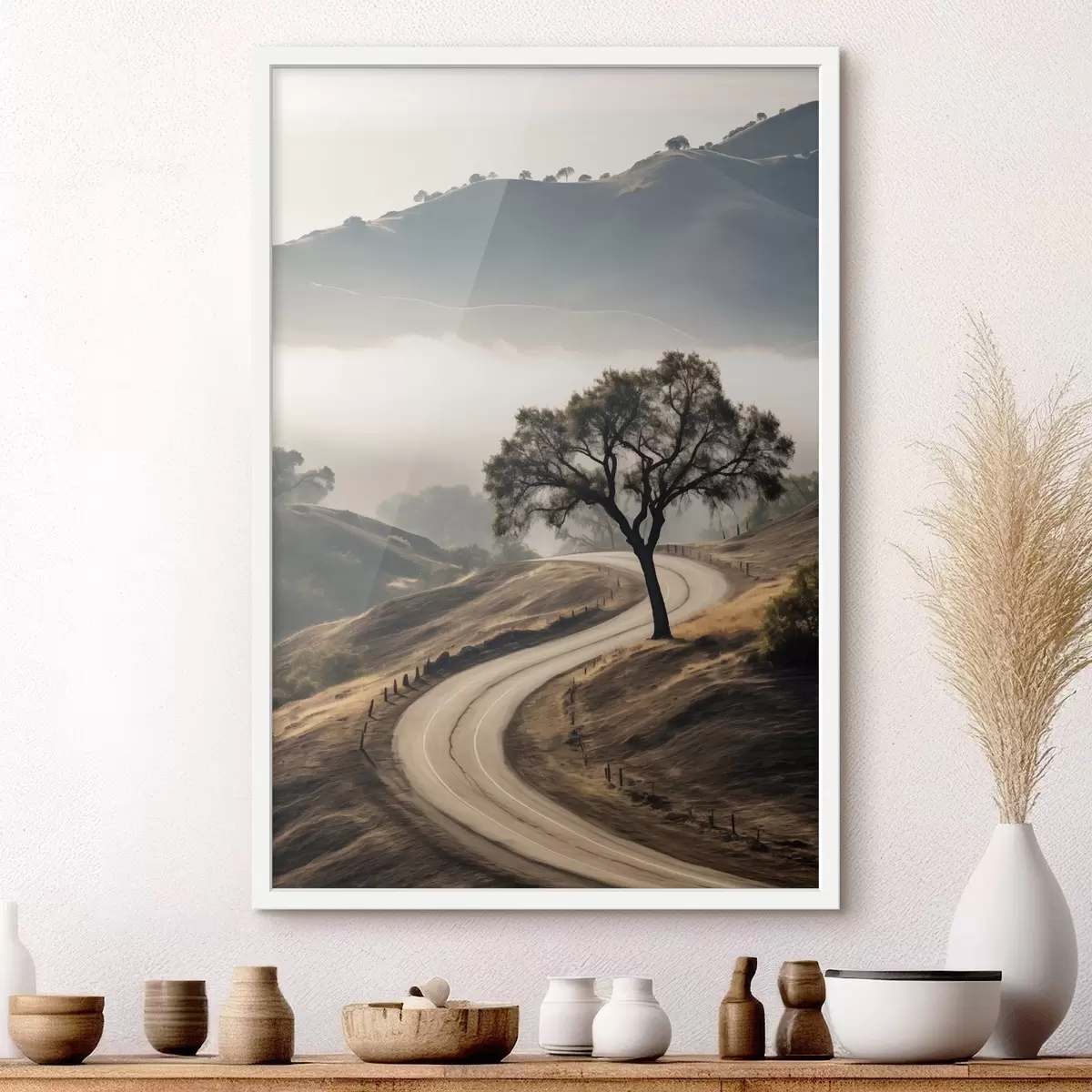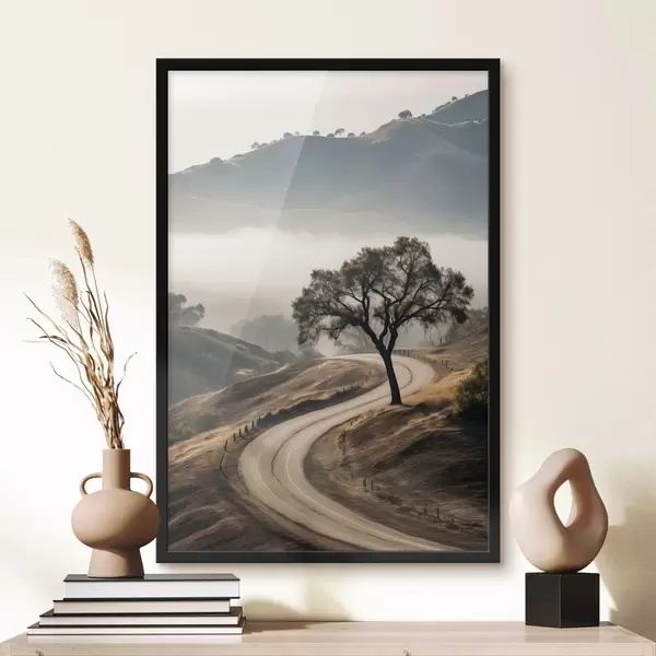 Poster Una strada tortuosa che attraversa dolci colline con un albero in primo piano, sullo sfondo nebbia e montagne Nr f46288