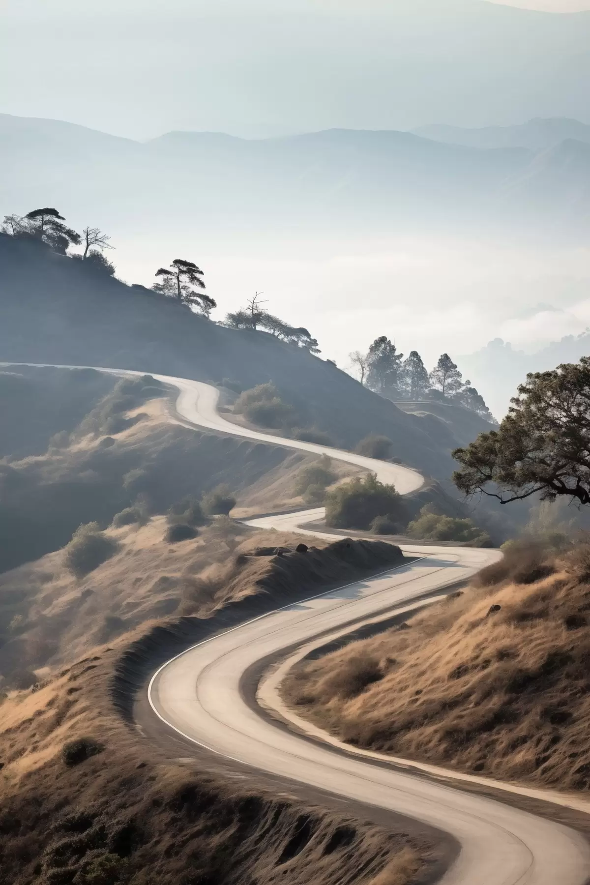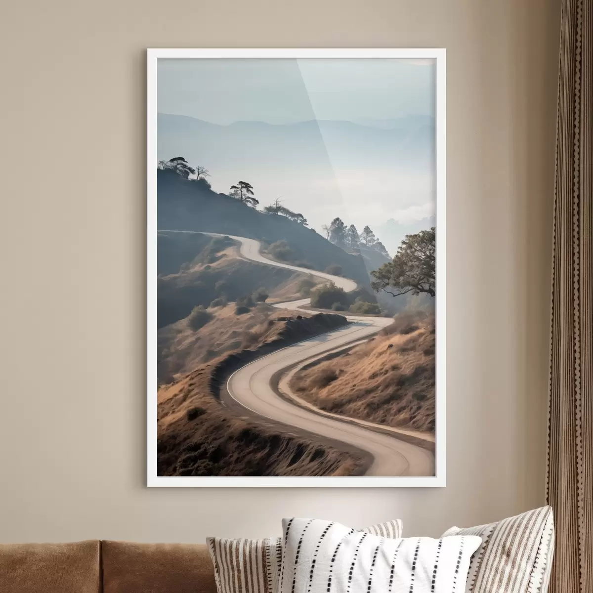 Poster Una strada tortuosa che attraversa un paesaggio collinare con erba secca sotto un cielo limpido e montagne in lontananza Nr f46289