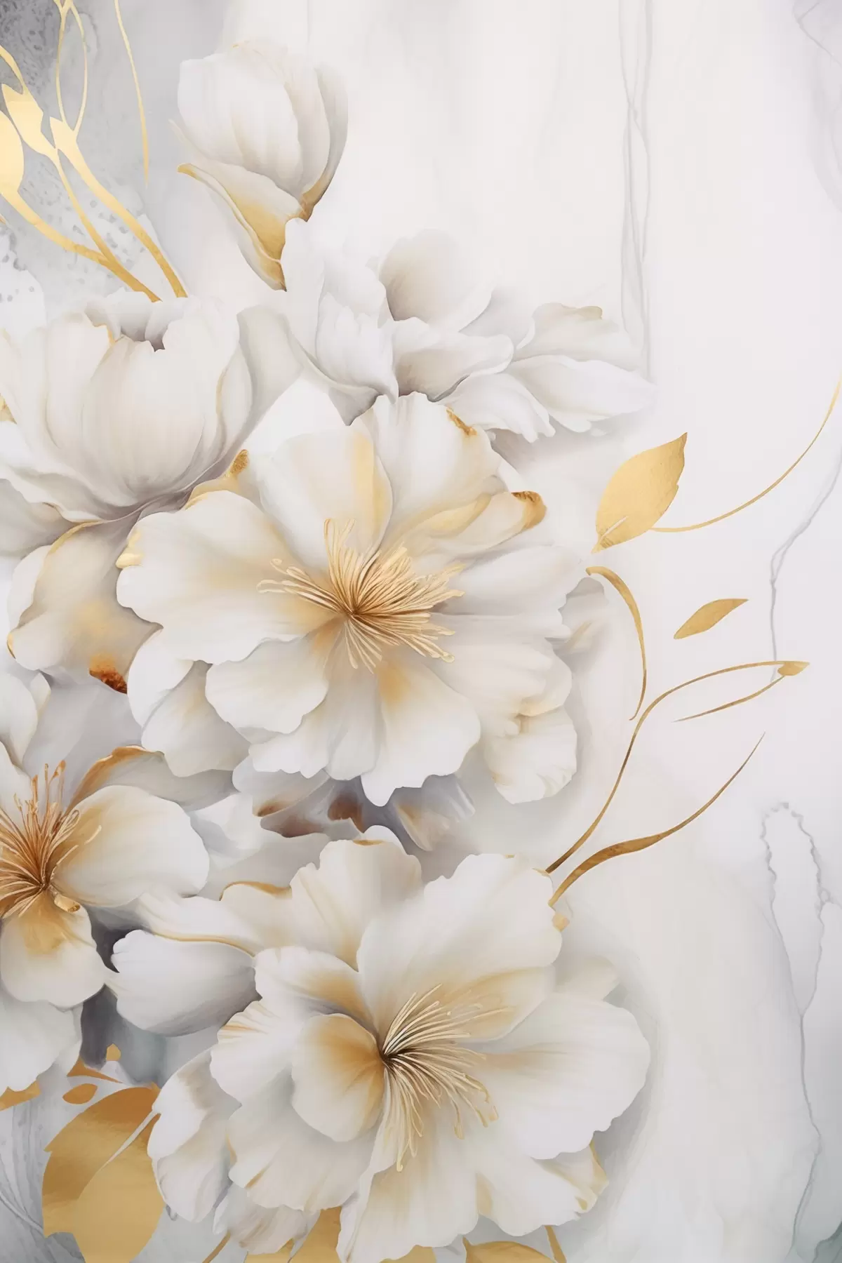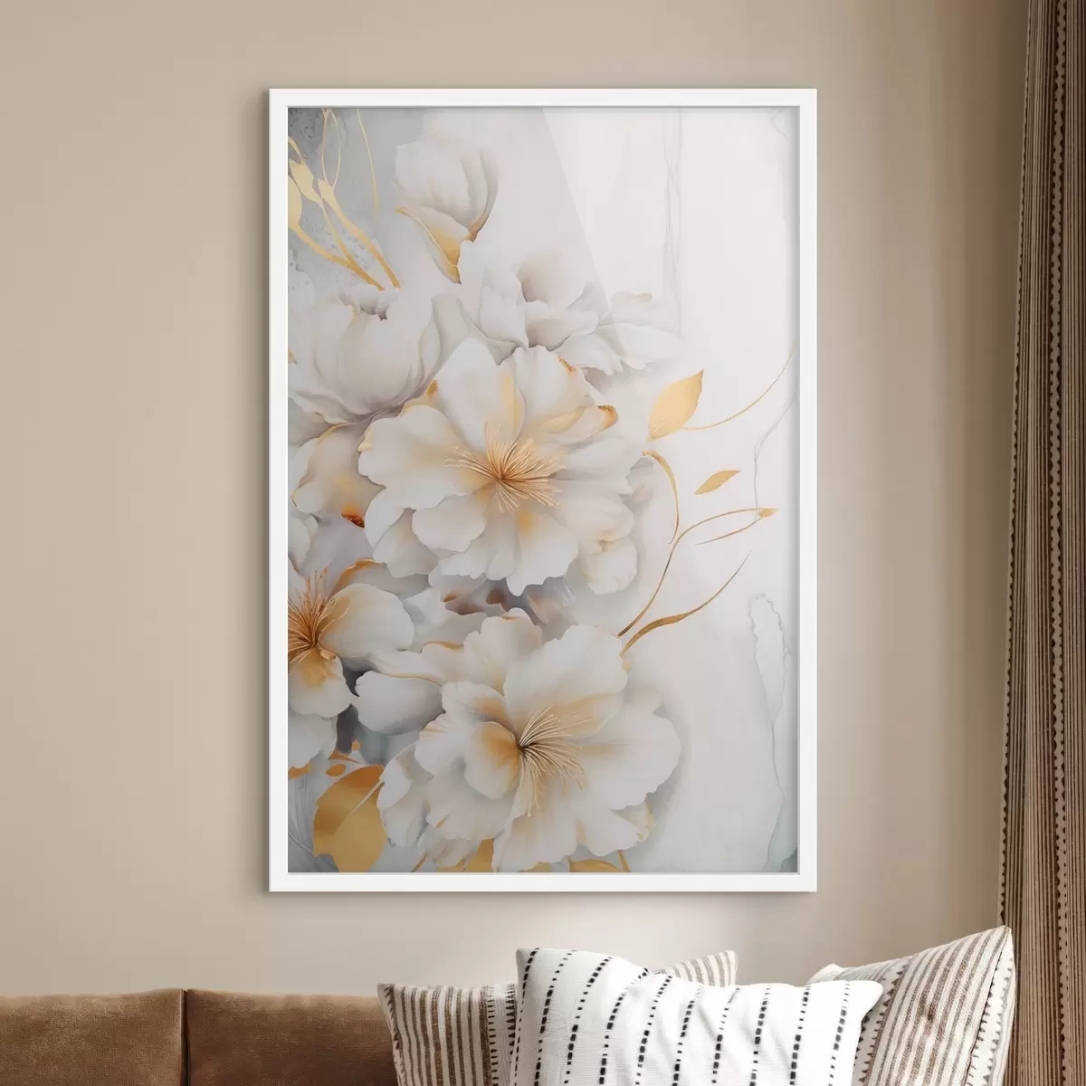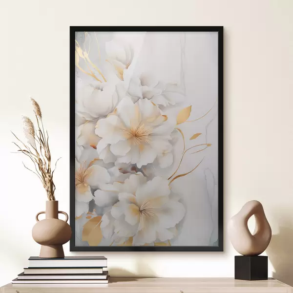 Poster Fiori bianchi con dettagli gialli, petali con sfumature delicate, sfondo chiaro con sottile effetto marmorizzato Nr f46292
