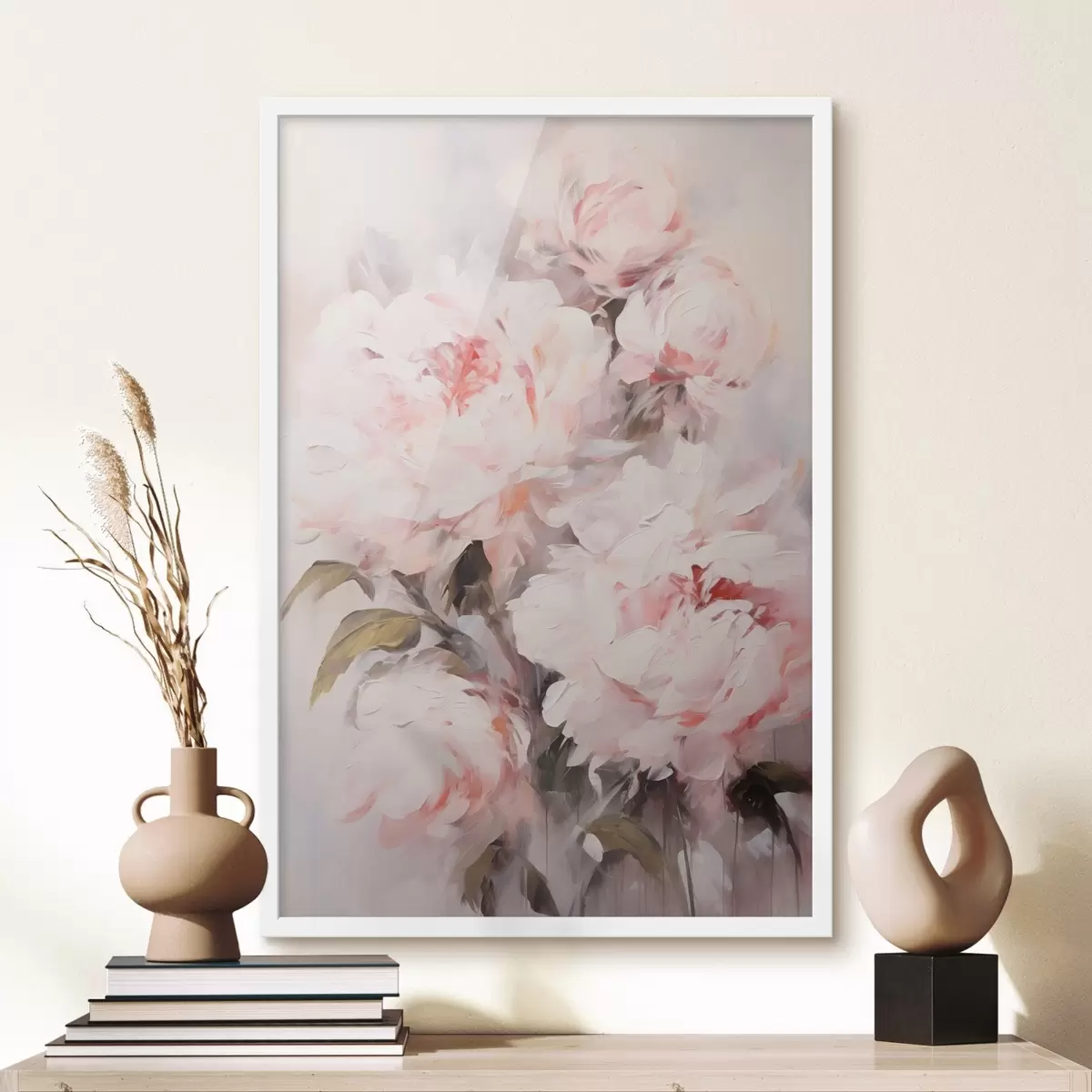 Poster Un bouquet di peonie rosa chiaro con foglie verdi, pennellate morbide, colori pastello, su uno sfondo chiaro Nr f46294