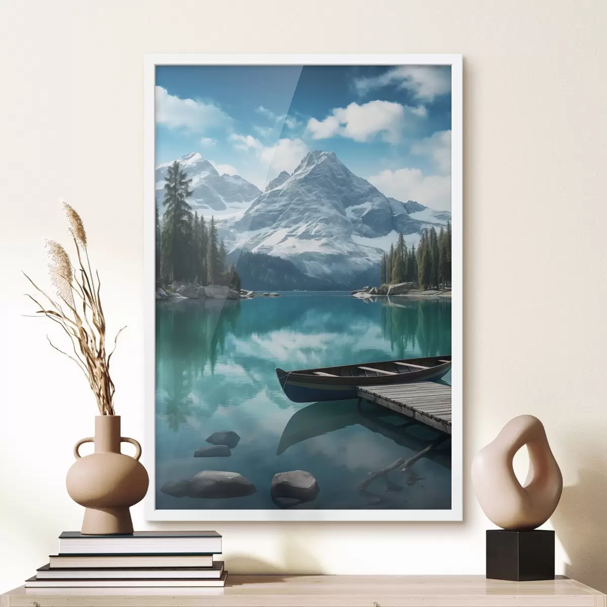 Poster Lago alpino con canoa e cime innevate Nr f46481