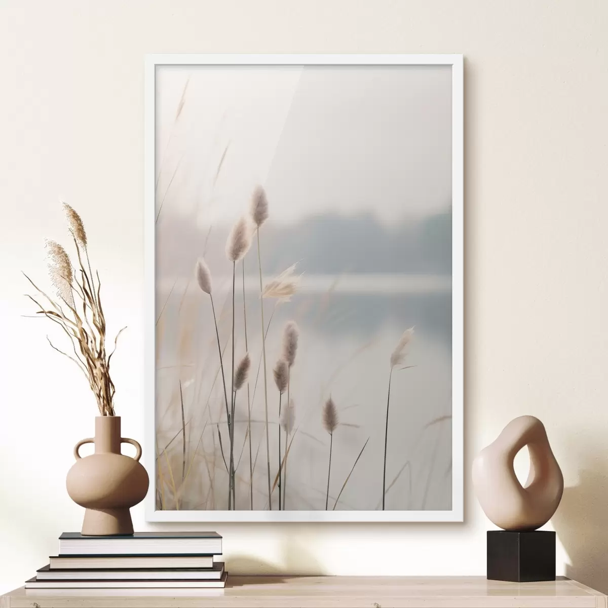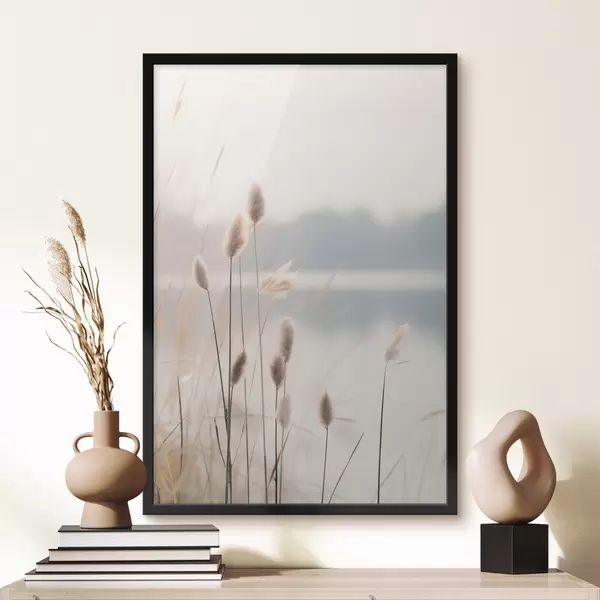 Poster Canneti morbidi in riva a un lago nebbioso, tonalità beige pastello Nr f46504