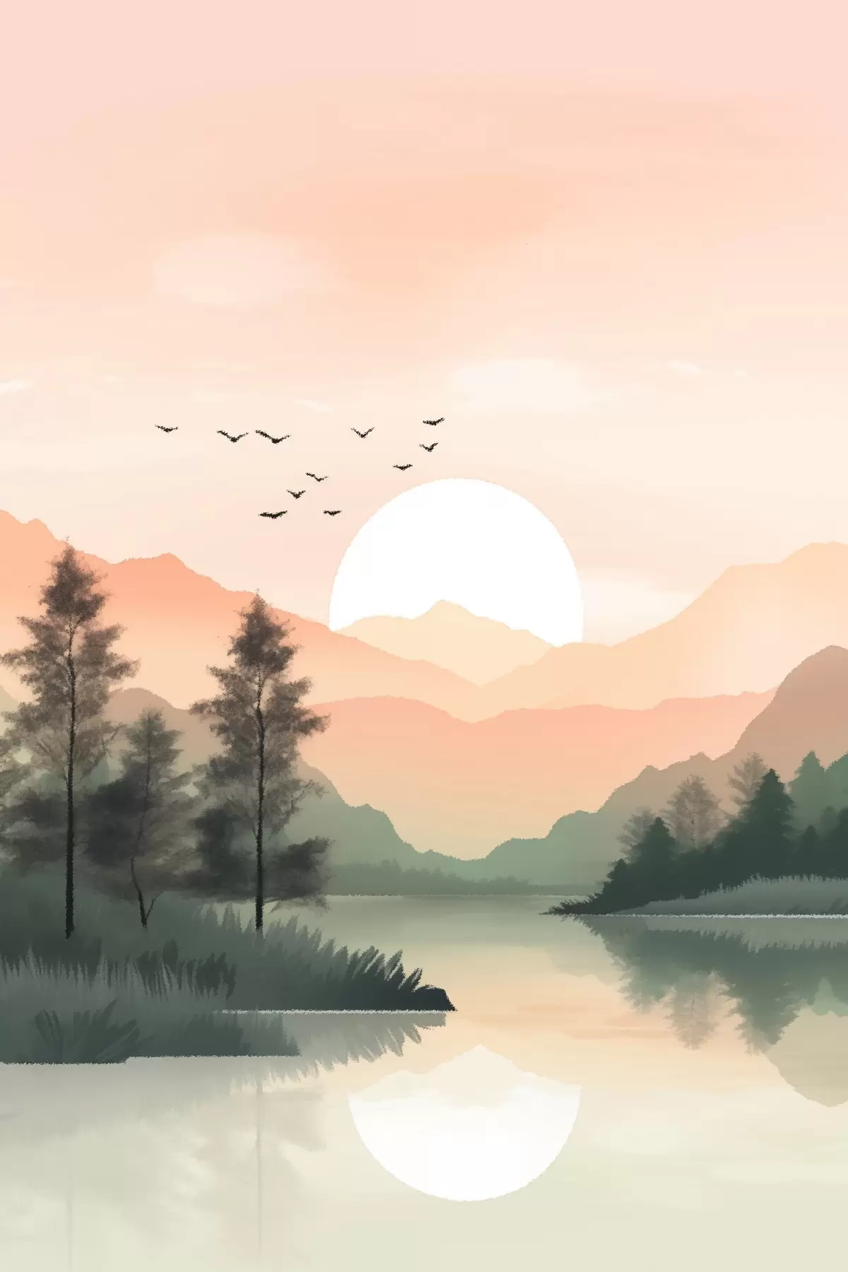 Poster Tramonto pastello su un lago tranquillo con colline lontane e uccelli f46508