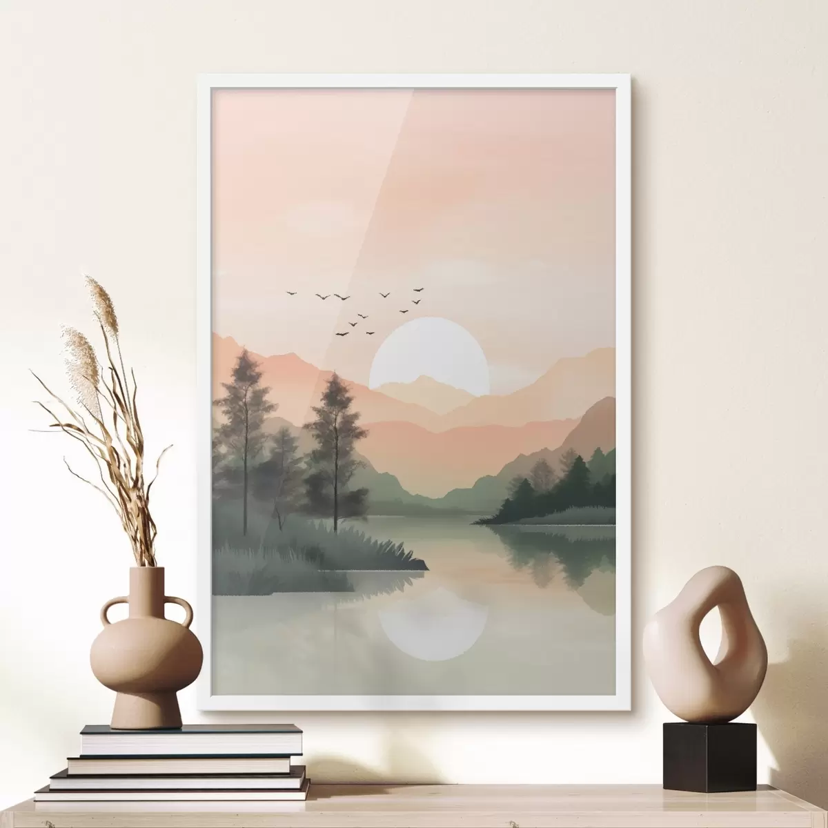 Poster Tramonto pastello su un lago tranquillo con colline lontane e uccelli Nr f46508