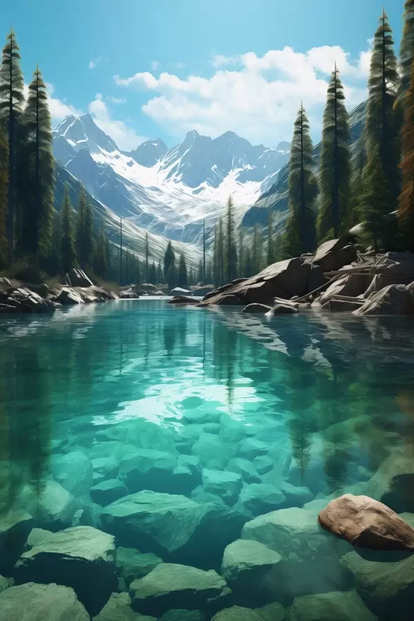 Poster Fiume alpino limpido con letto roccioso e cime innevate Nr f46514