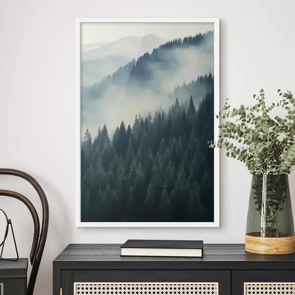 Poster Nebbia sui pendii ricoperti di conifere, tonalità di verde intenso Nr f46516