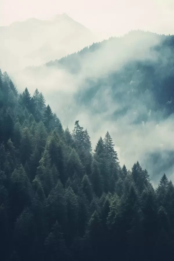 Poster Crinali montuosi avvolti dalla nebbia e fitte foreste di conifere f46518