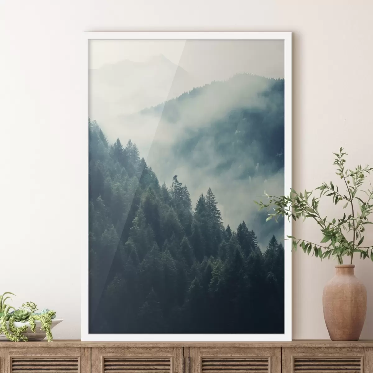 Poster Crinali montuosi avvolti dalla nebbia e fitte foreste di conifere Nr f46518