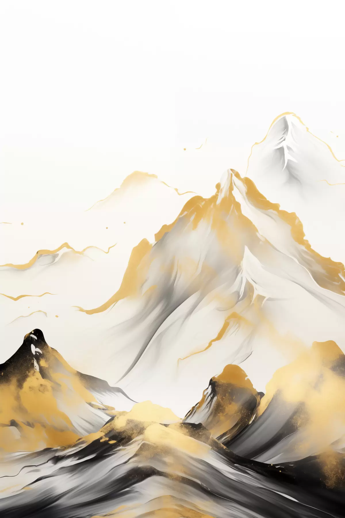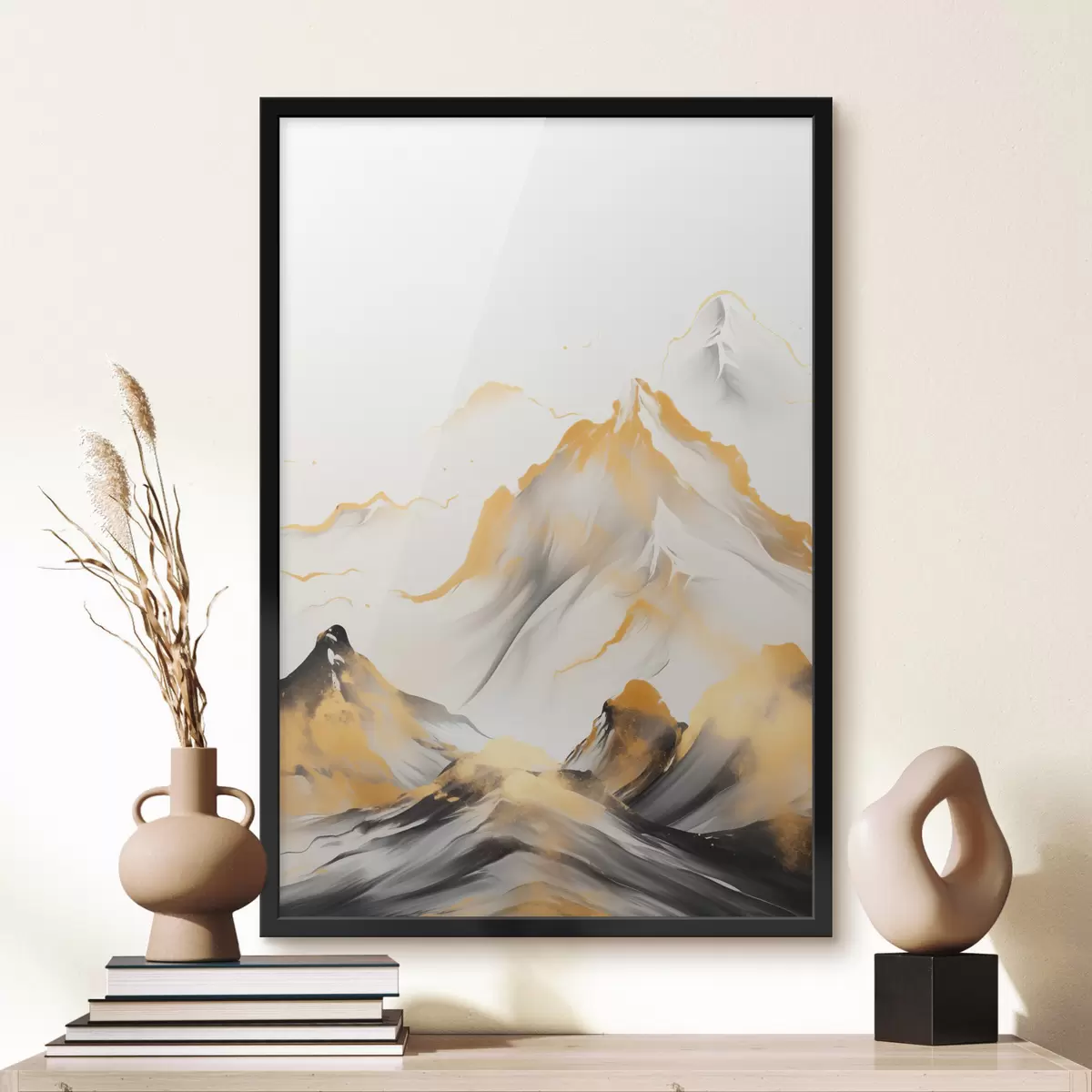 Poster Montagne gialle e nere con cime innevate, stile pittorico a inchiostro, catena montuosa minimalista Nr f46683