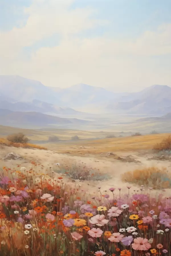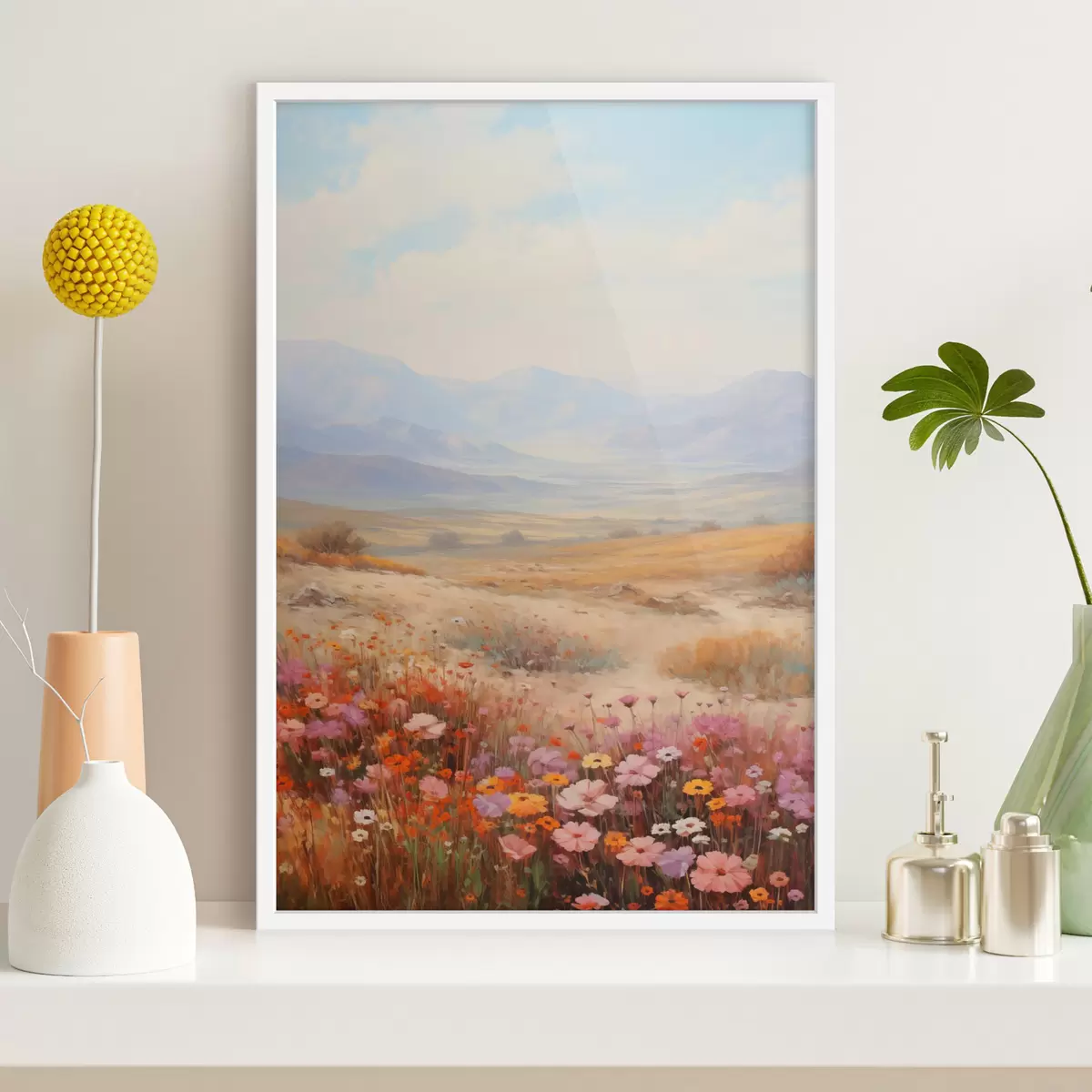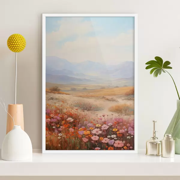Poster Paesaggio, un campo di fiori colorati con le montagne sullo sfondo, colori tenui e pastello Nr f46685