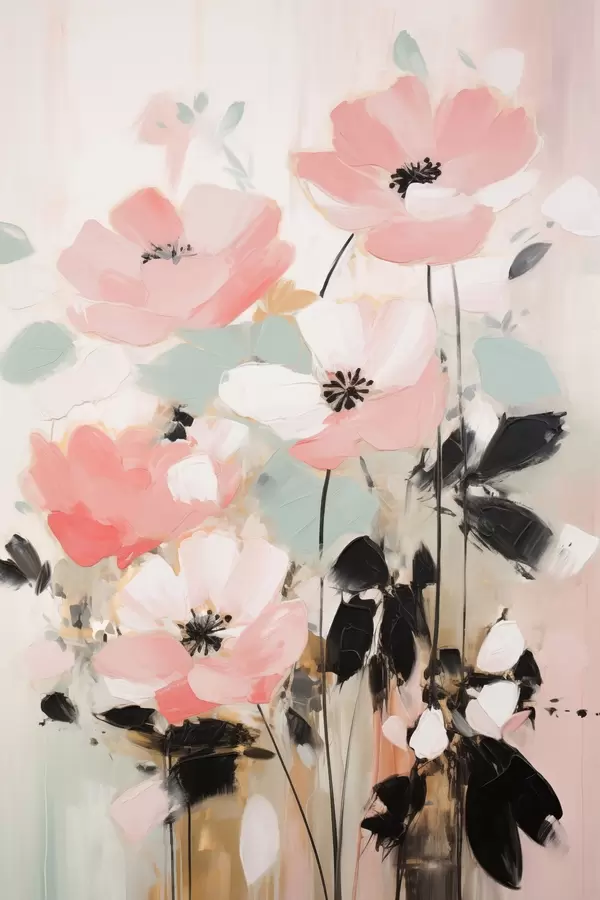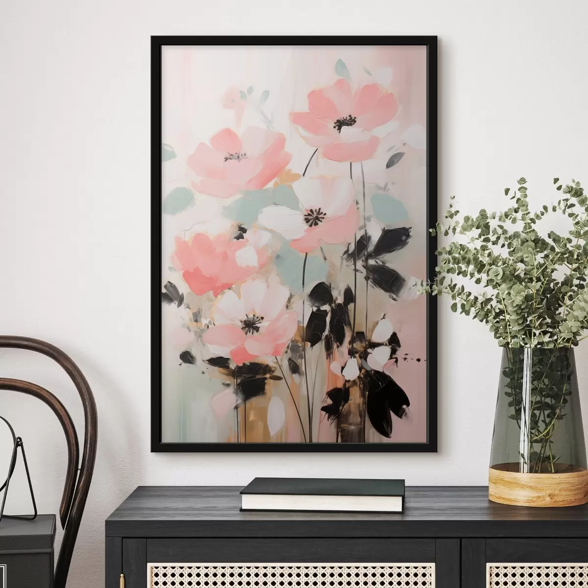Poster Fiori rosa e neri con foglie, colori pastello tenui, composizione floreale astratta, arte minimalista Nr f46688
