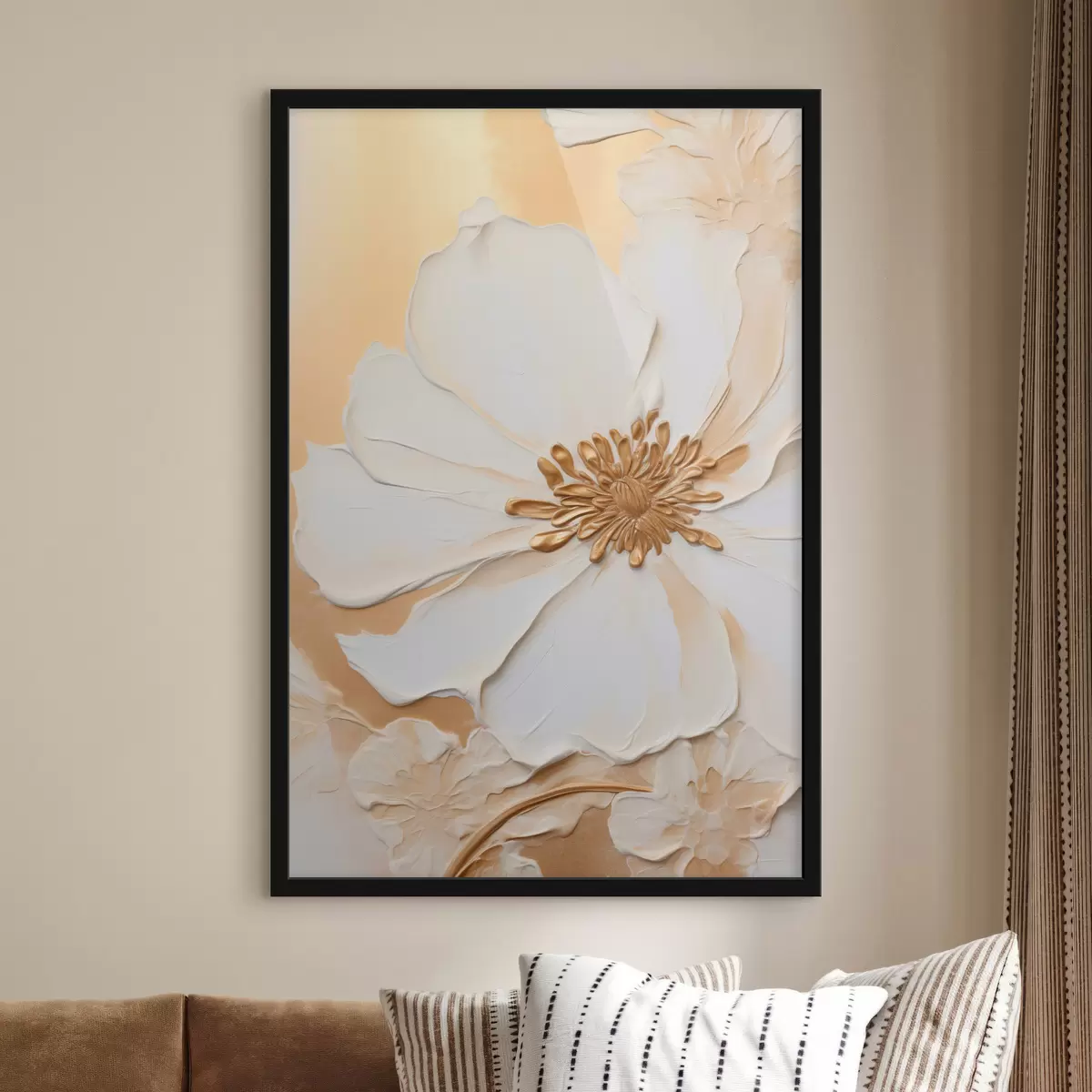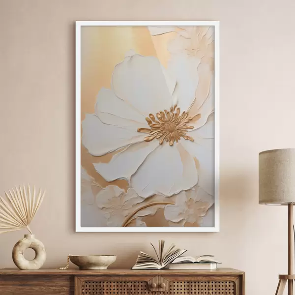 Poster Fiore bianco con petali delicati e pennellate spesse imitazione, su sfondo arancione chiaro testurizzato Nr f46691