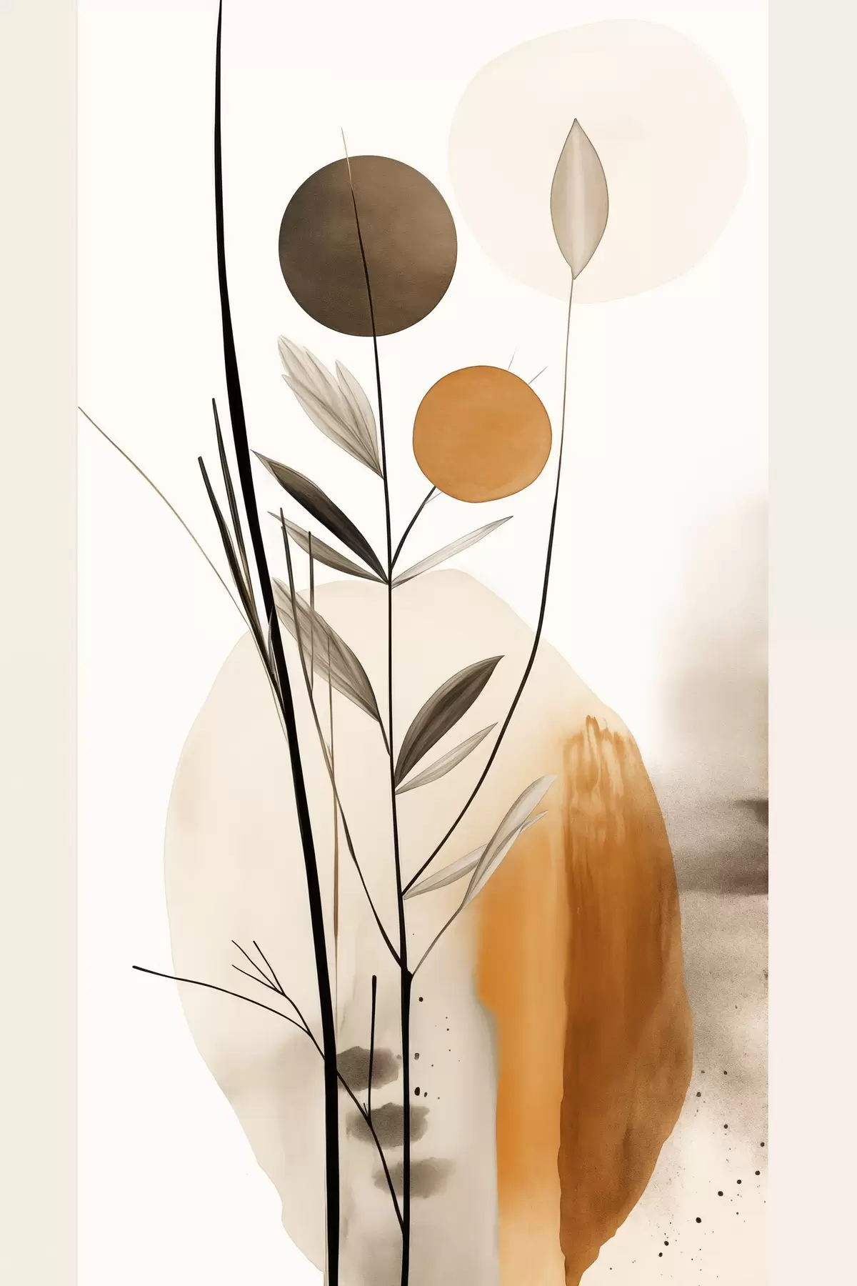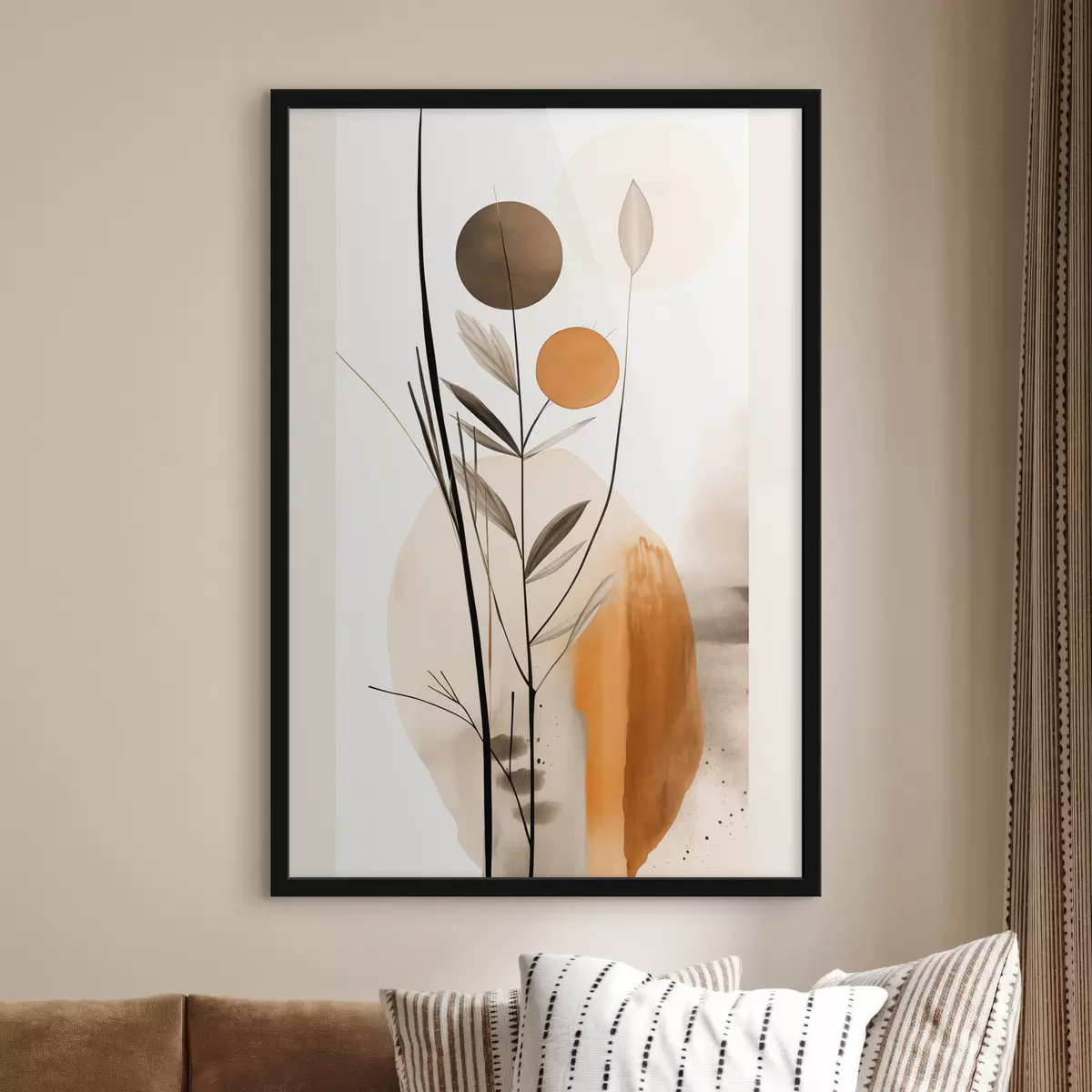 Poster Imitazione di pittura astratta con cerchi arancioni e grigi, foglie e rami, stile moderno, effetto acquerello Nr f46698