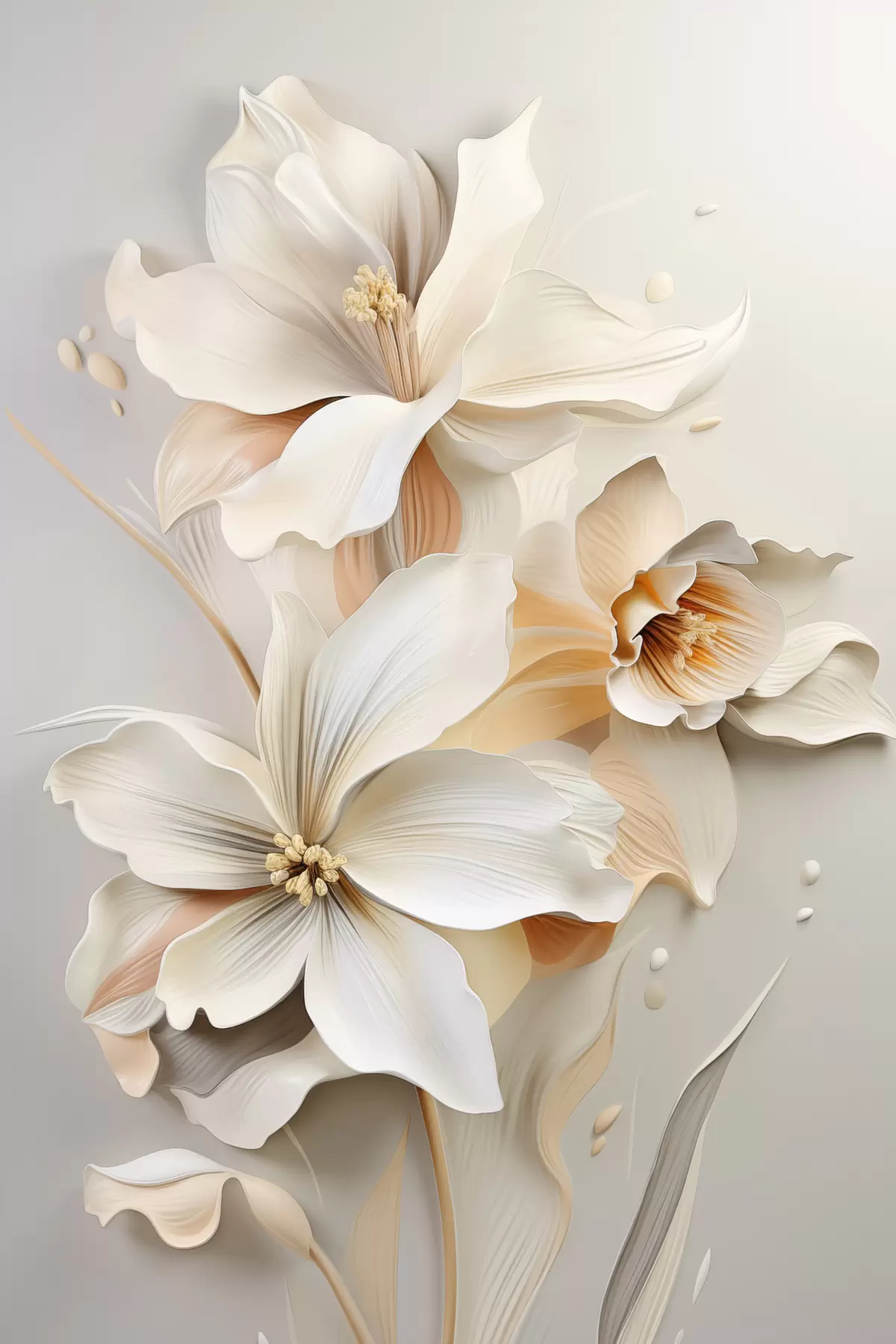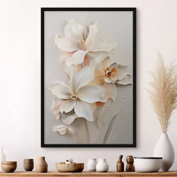 Poster Fiori bianchi, petali con ombre delicate, sfondo beige chiaro, composizione elegante, stile minimalista Nr f46699