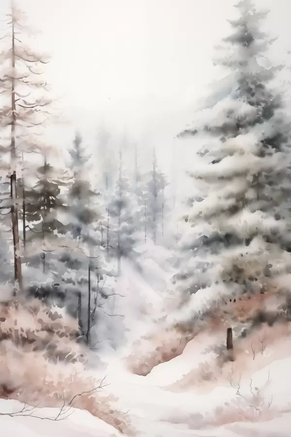 Poster Alti pini ricoperti di neve, immersi in una foresta avvolta dalla nebbia, una scena invernale morbida e ovattata Nr f46702