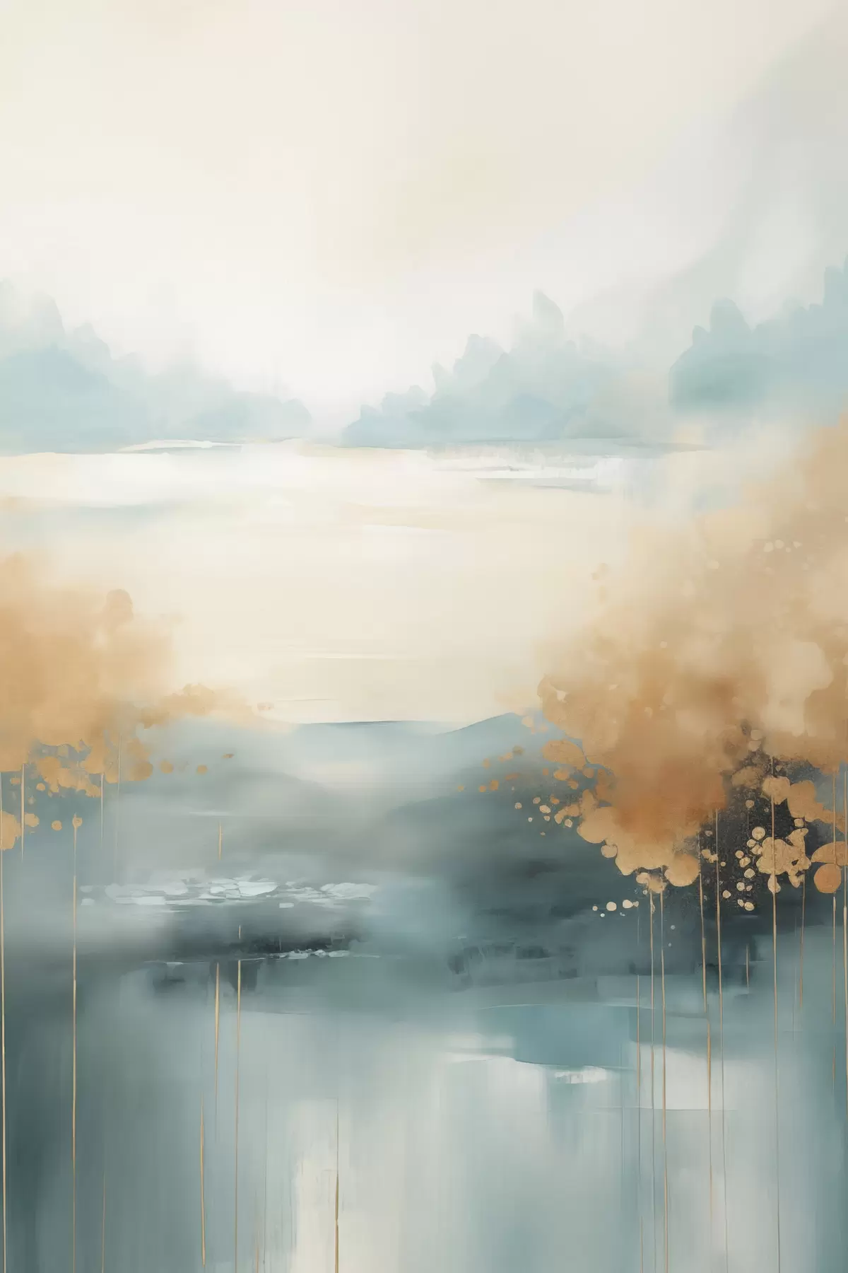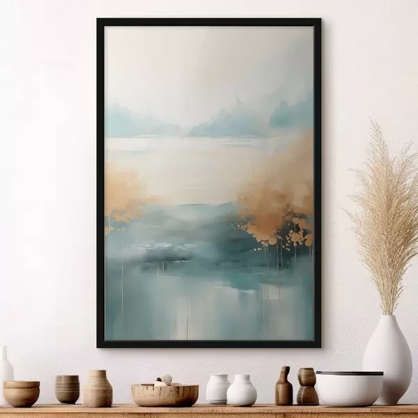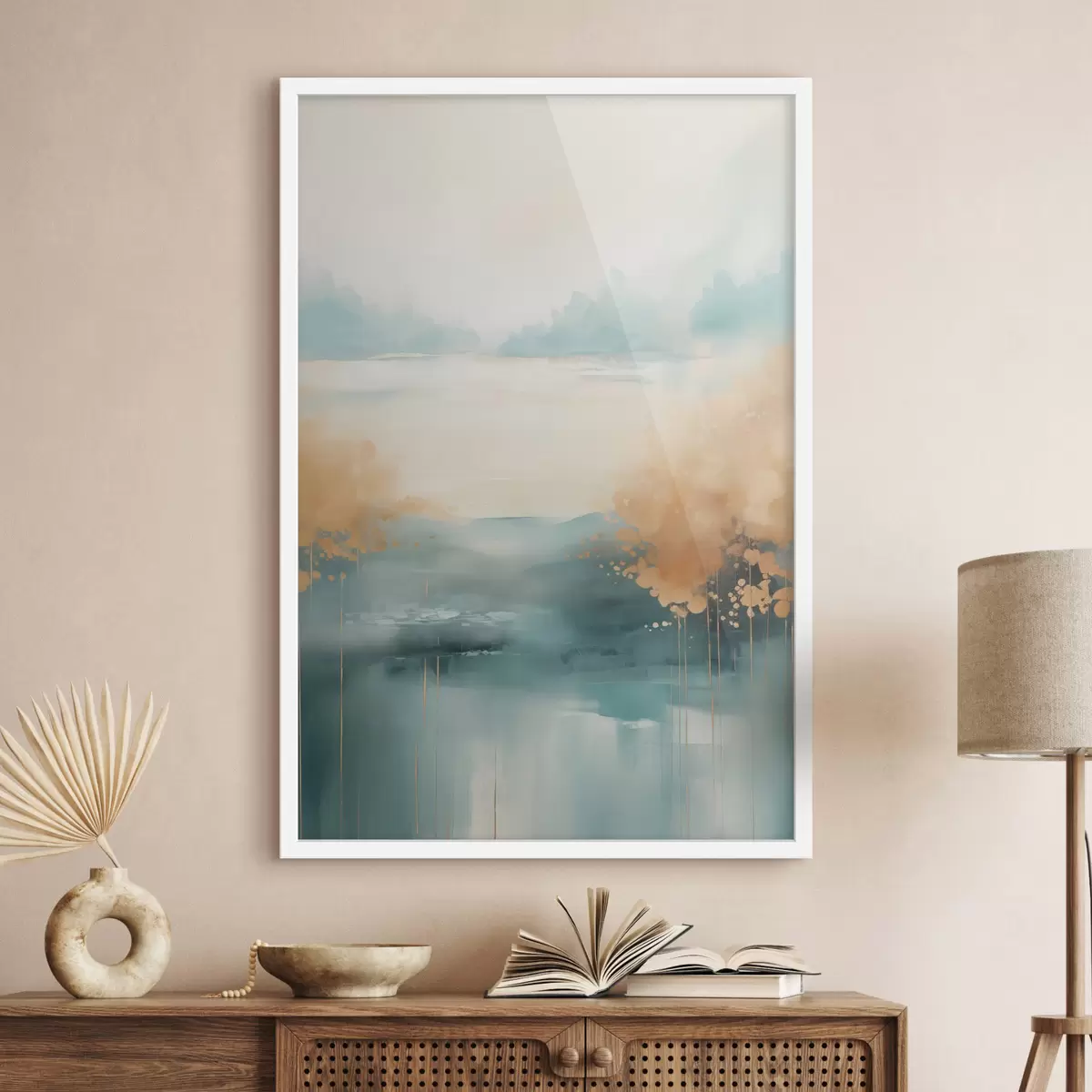 Poster Paesaggio astratto con montagne e lago in verde acqua e giallo materico, pennellate morbide, opera d'arte minimalista Nr f46704