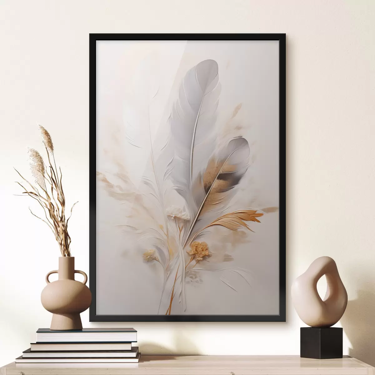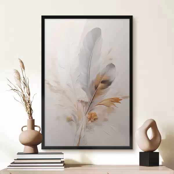 Poster Piume astratte, circondate da pennacchi beige e marroni, morbide e delicate, su uno sfondo beige chiaro. f46712