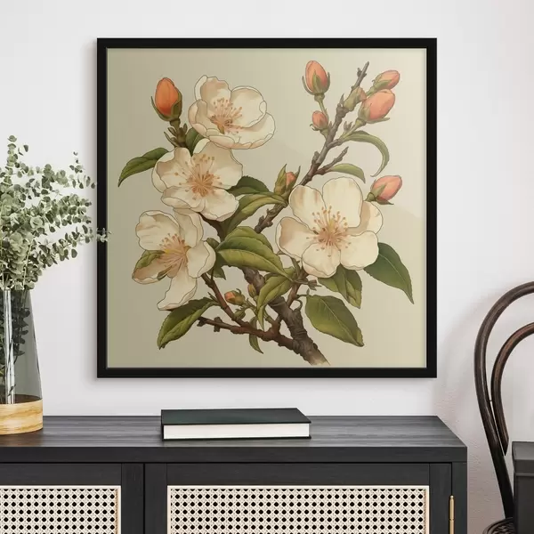 Poster Ramo fiorito con fiori bianchi su sfondo beige nello stile dell'illustrazione classica Nr f46923