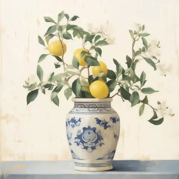 Poster Limoni in un vaso di ceramica blu e bianco in stile pittura a olio Nr f46924