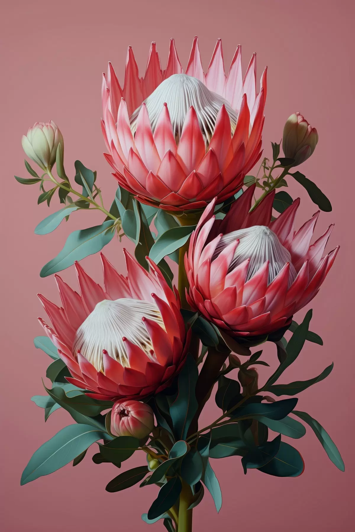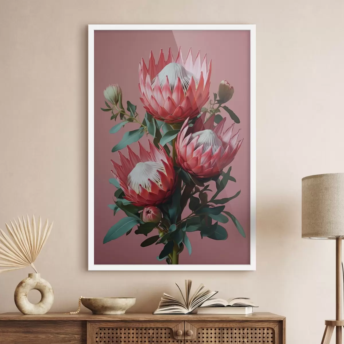 Poster Bouquet di protea con petali rossi e fogliame verde su sfondo rosa f46946