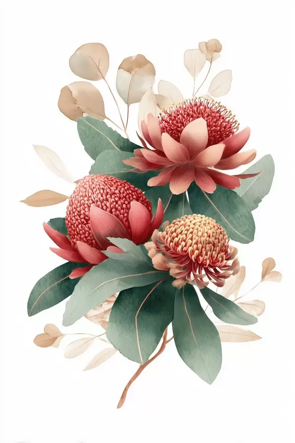 Poster Composizione floreale con grandi protee ed eucalipto in stile illustrazione digitale moderna Nr f46955
