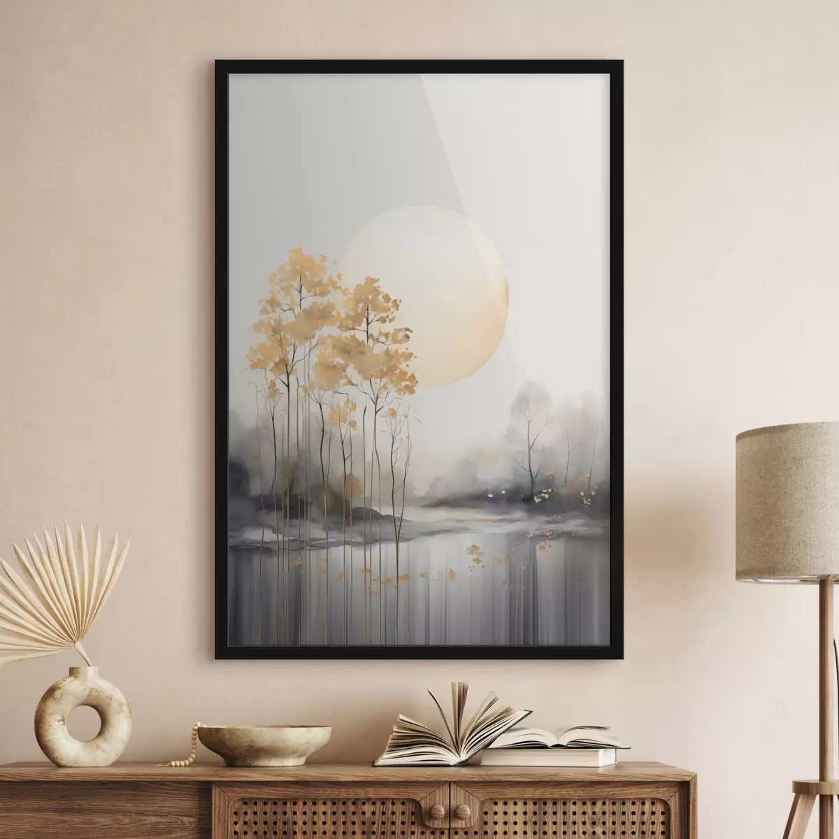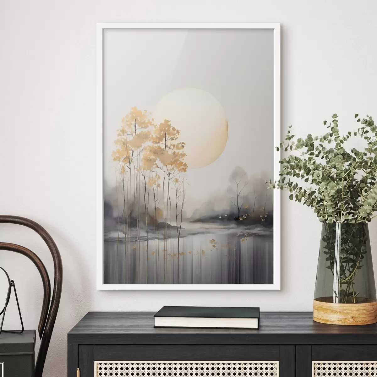 Poster Paesaggio astratto decorativo, alberi alti con foglie gialle, un fiume e nebbia sullo sfondo f47014