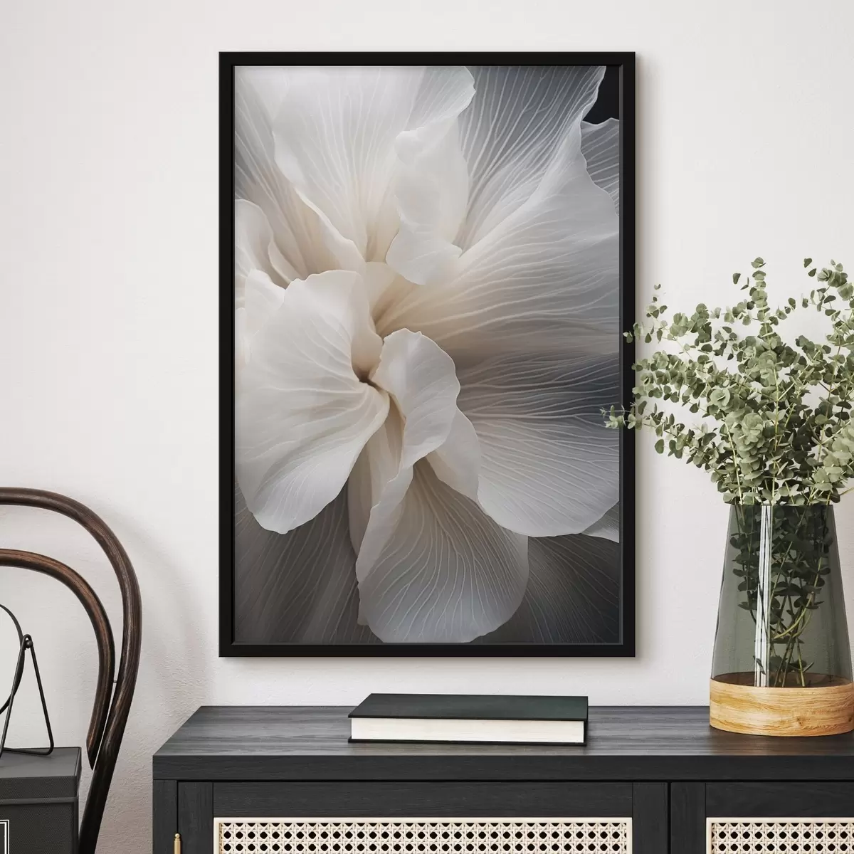 Poster Primo piano di delicati petali floreali bianchi astratti con linee intricate e uno sfondo scuro sfocato f47018