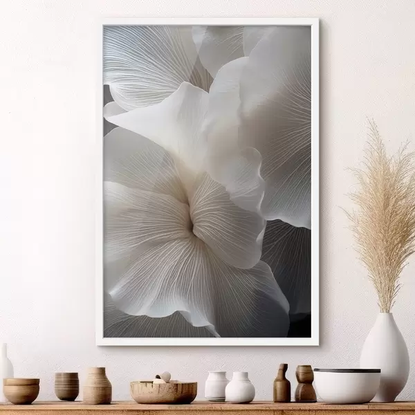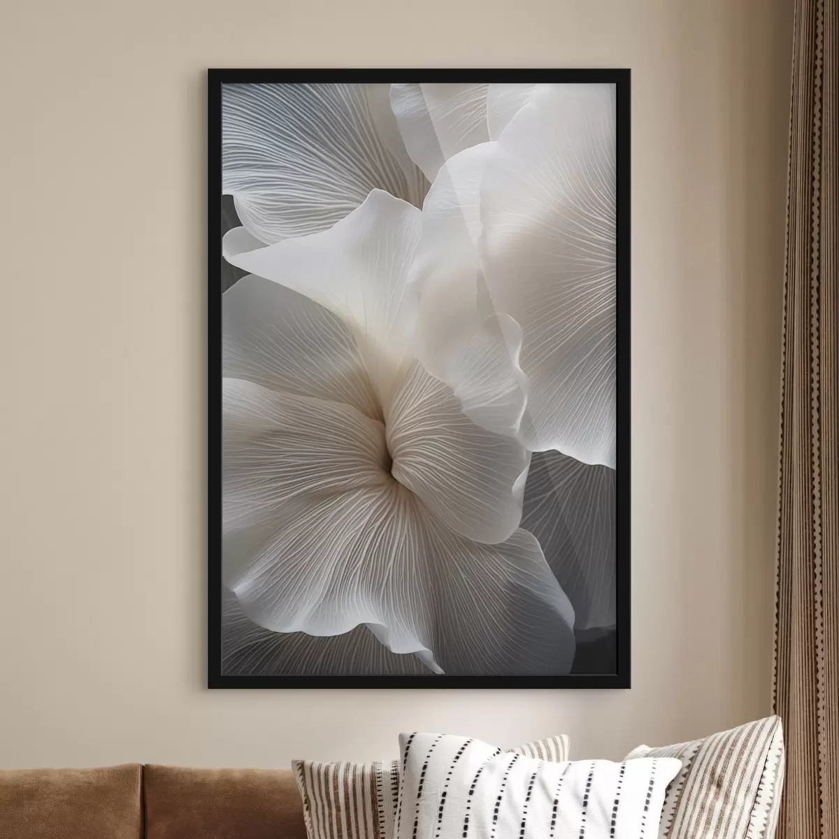 Poster Primo piano di delicati petali floreali bianchi astratti con linee intricate e uno sfondo scuro sfocato f47019