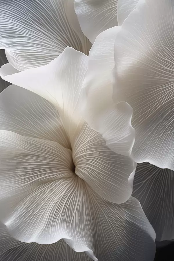 Poster Primo piano di delicati petali floreali bianchi astratti con linee intricate e uno sfondo scuro sfocato f47019