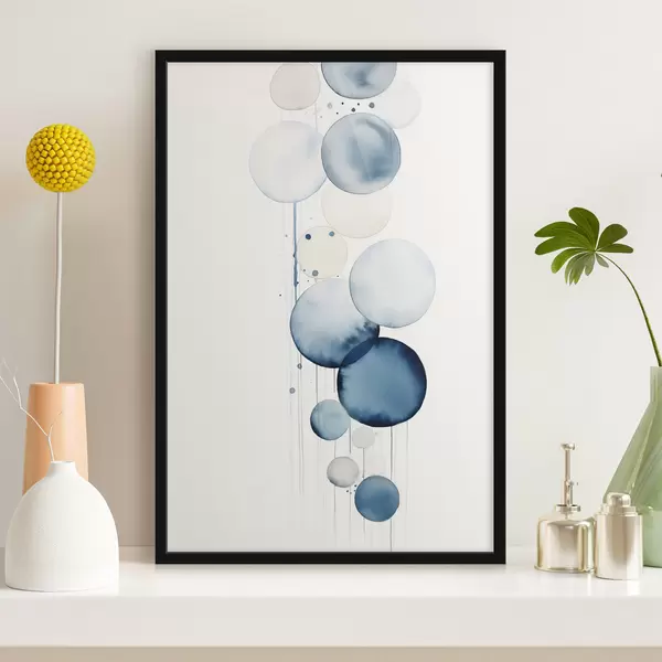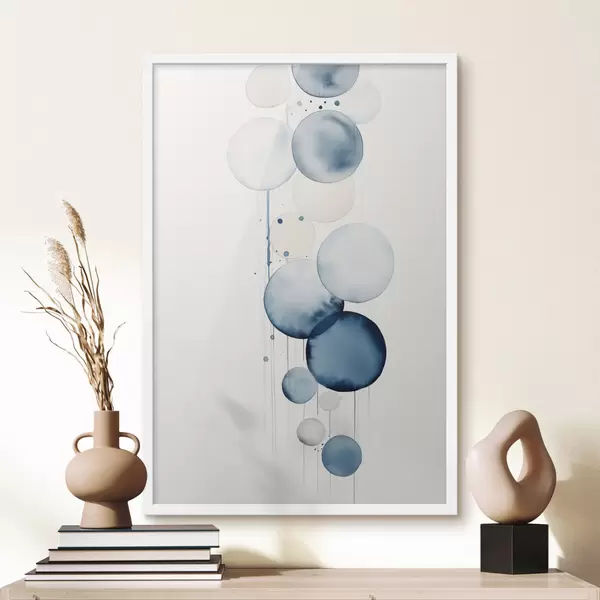 Poster Testo astratto con cerchi acquerellati blu e bianchi di varie dimensioni, su sfondo bianco f47020