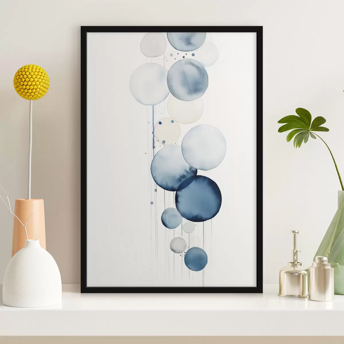 Poster Testo astratto con cerchi acquerellati blu e bianchi di varie dimensioni, su sfondo bianco Nr f47020