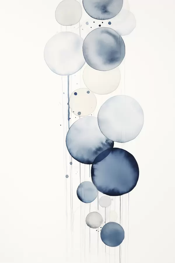 Poster Testo astratto con cerchi acquerellati blu e bianchi di varie dimensioni, su sfondo bianco Nr f47020