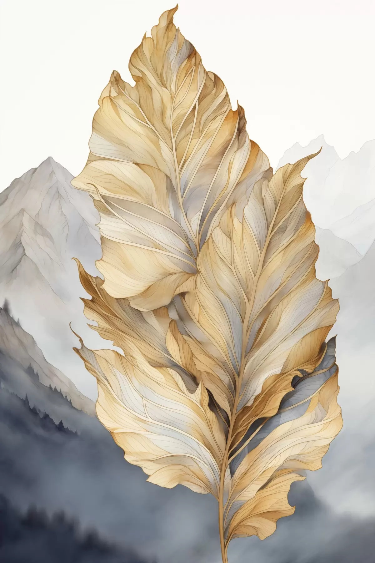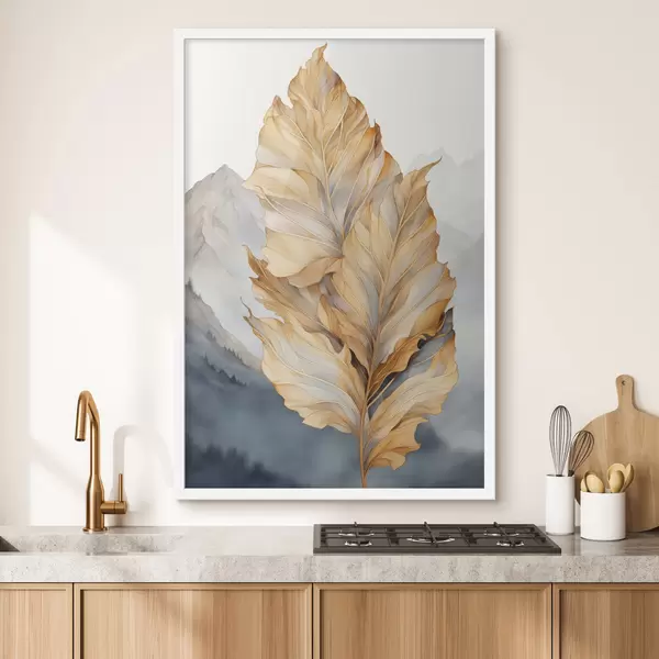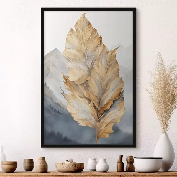 Poster Foglie astratte grandi, gialle e marroni con dettagli intricati, sullo sfondo di un paesaggio montano Nr f47022
