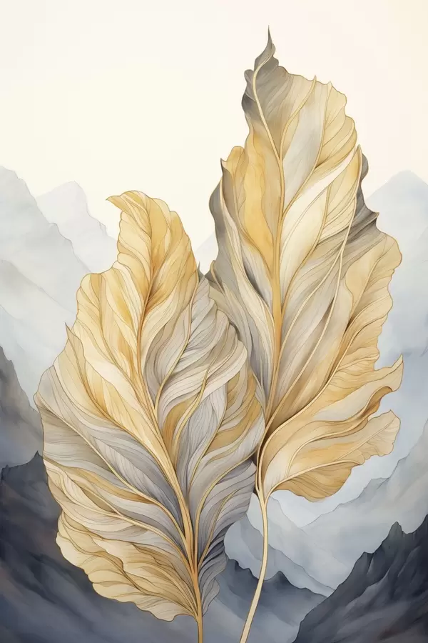 Poster Foglie astratte grandi, gialle e marroni con dettagli intricati, sullo sfondo di un paesaggio montano Nr f47023