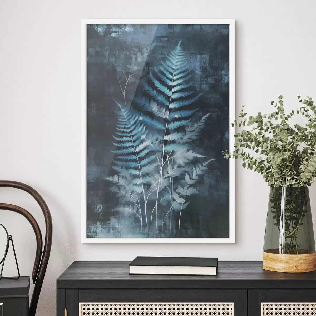 Poster Felci blu e piante su uno sfondo scuro e strutturato, con particolare attenzione ai dettagli intricati, effetto radiografico Nr f47026