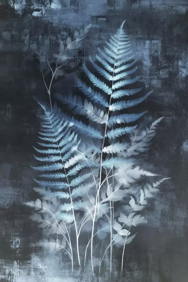 Poster Felci blu e piante su uno sfondo scuro e strutturato, con particolare attenzione ai dettagli intricati, effetto radiografico Nr f47026
