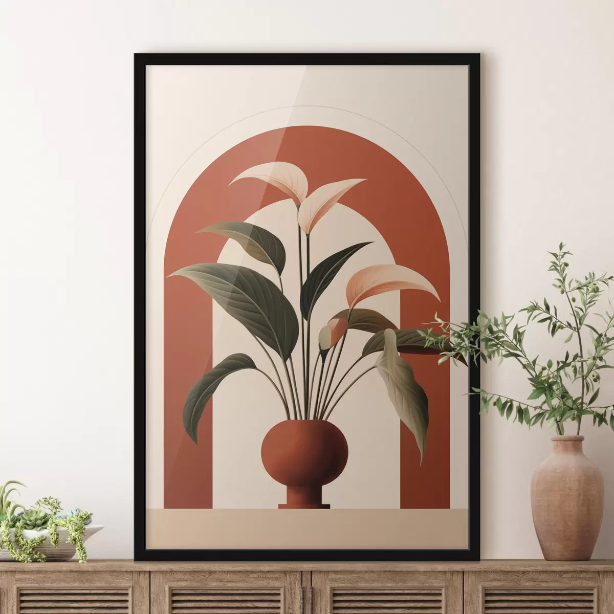 Poster Pianta in vaso astratta con grandi foglie verdi e beige davanti a un arco color crema con un accento terracotta Nr f47032