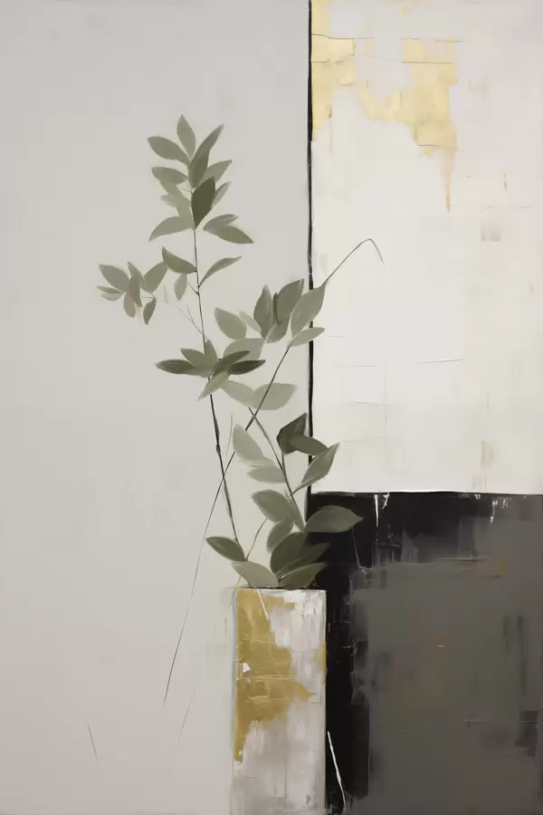 Poster Un dipinto minimalista e materico raffigurante un vaso con foglie verdi su uno sfondo di forme geometriche astratte Nr f47036