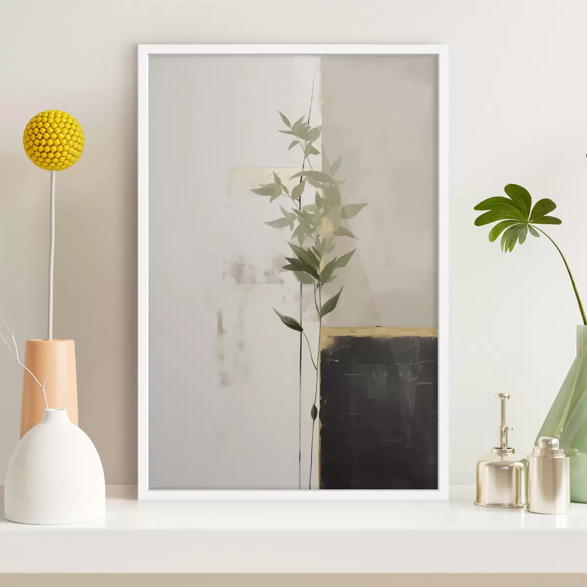 Poster Un dipinto minimalista e materico raffigurante un vaso con foglie verdi su uno sfondo di forme geometriche astratte. f47037
