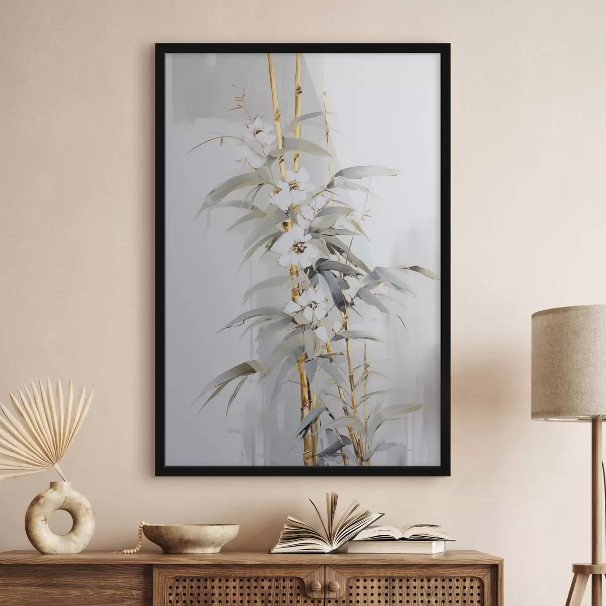 Poster Fusti di bambù astratti con accenti gialli, delicati fiori bianchi e foglie verde chiaro, sfondo grigio Nr f47039