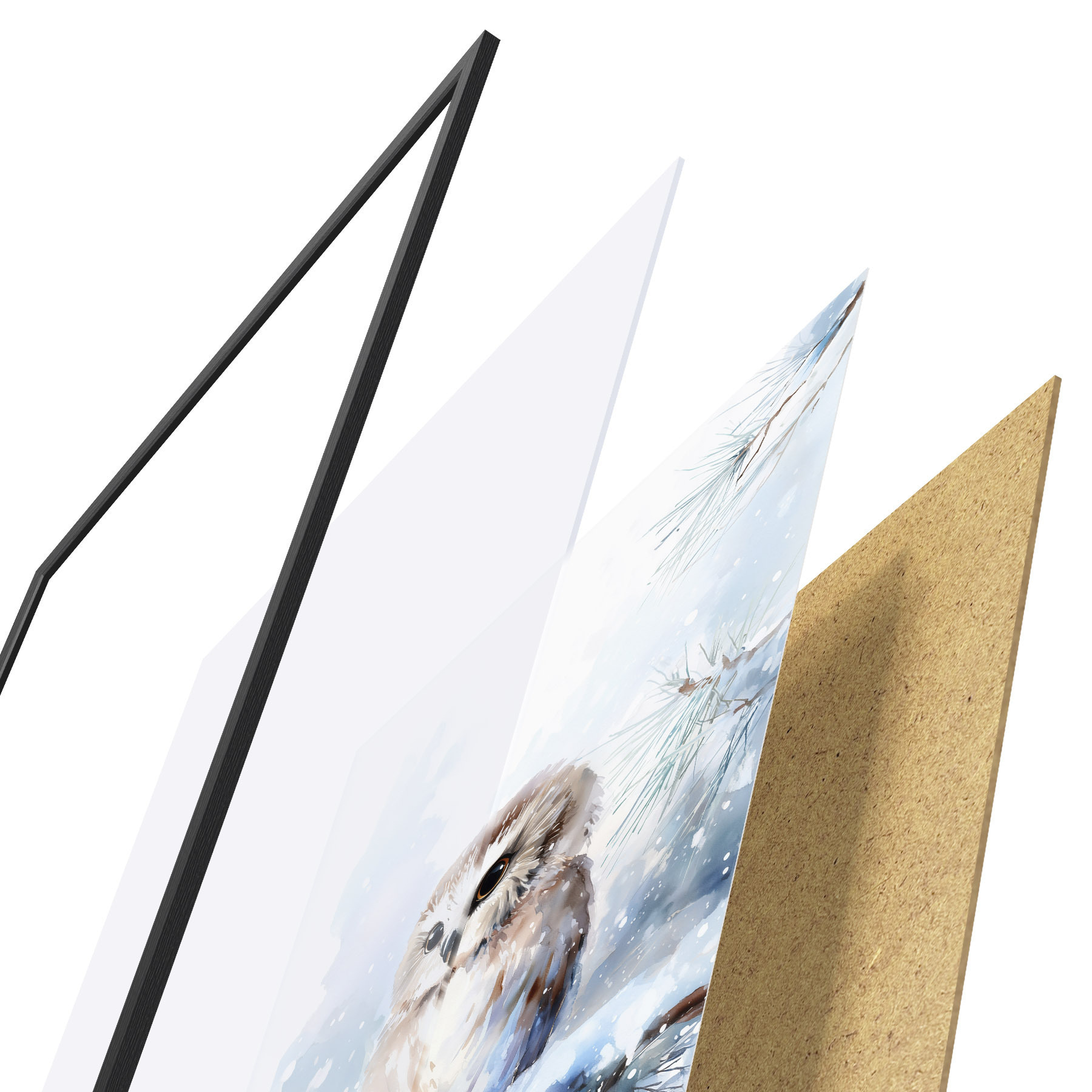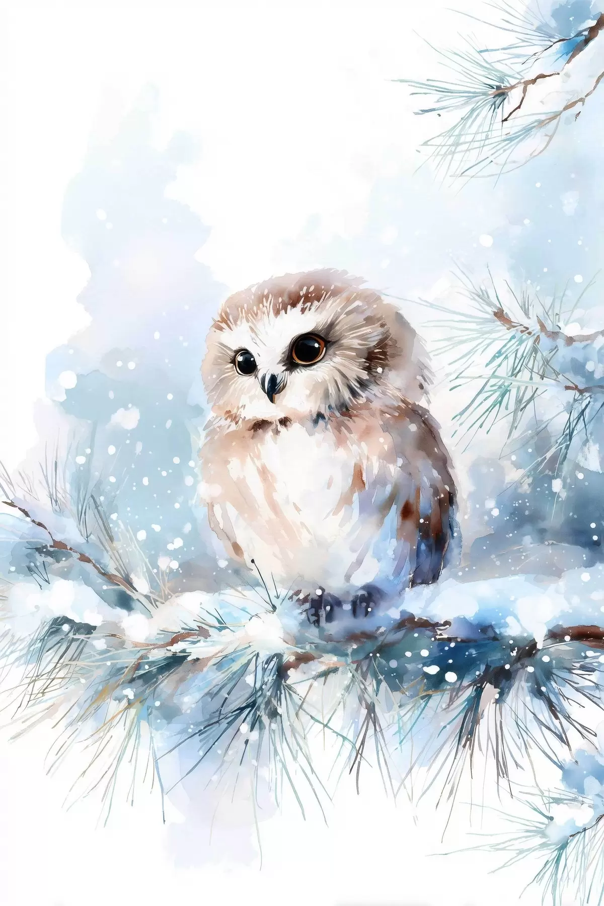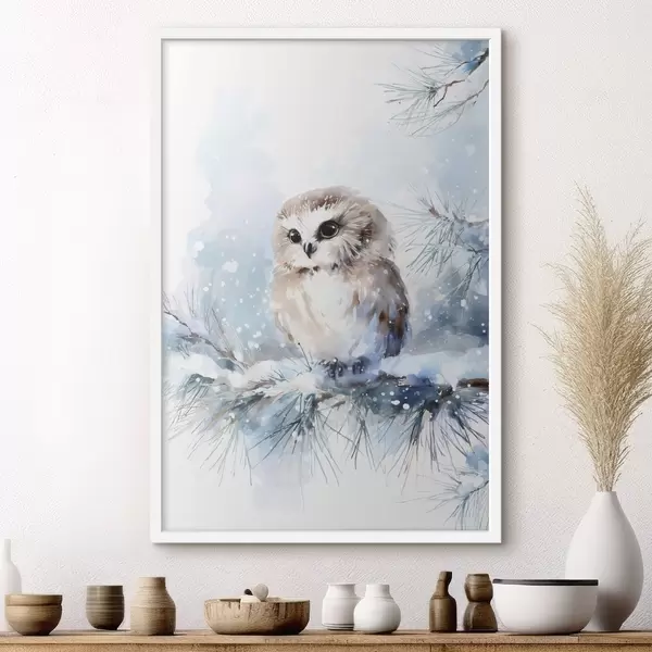 Poster simpatico gufo su un ramo di pino innevato in stile acquerello Nr f47115